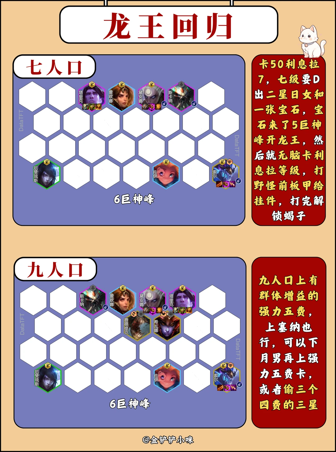 5️⃣阶段九人口D二星龙王,上有群体增益的五费卡,月男这类挂件牌可以换成强力五费,阵容大成