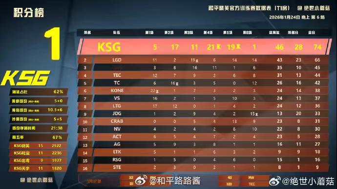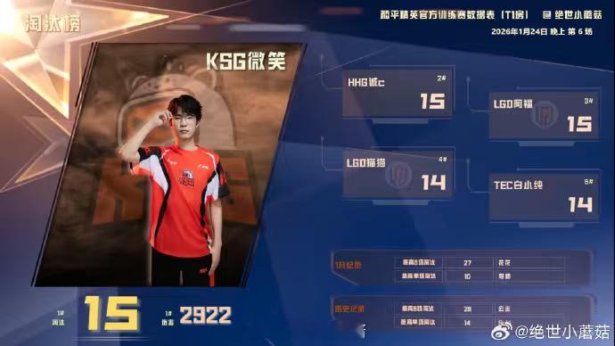 1.24官训T1晚场战报来啦恭喜获得积分榜一恭喜微笑拿下淘汰榜首Cr:2026P