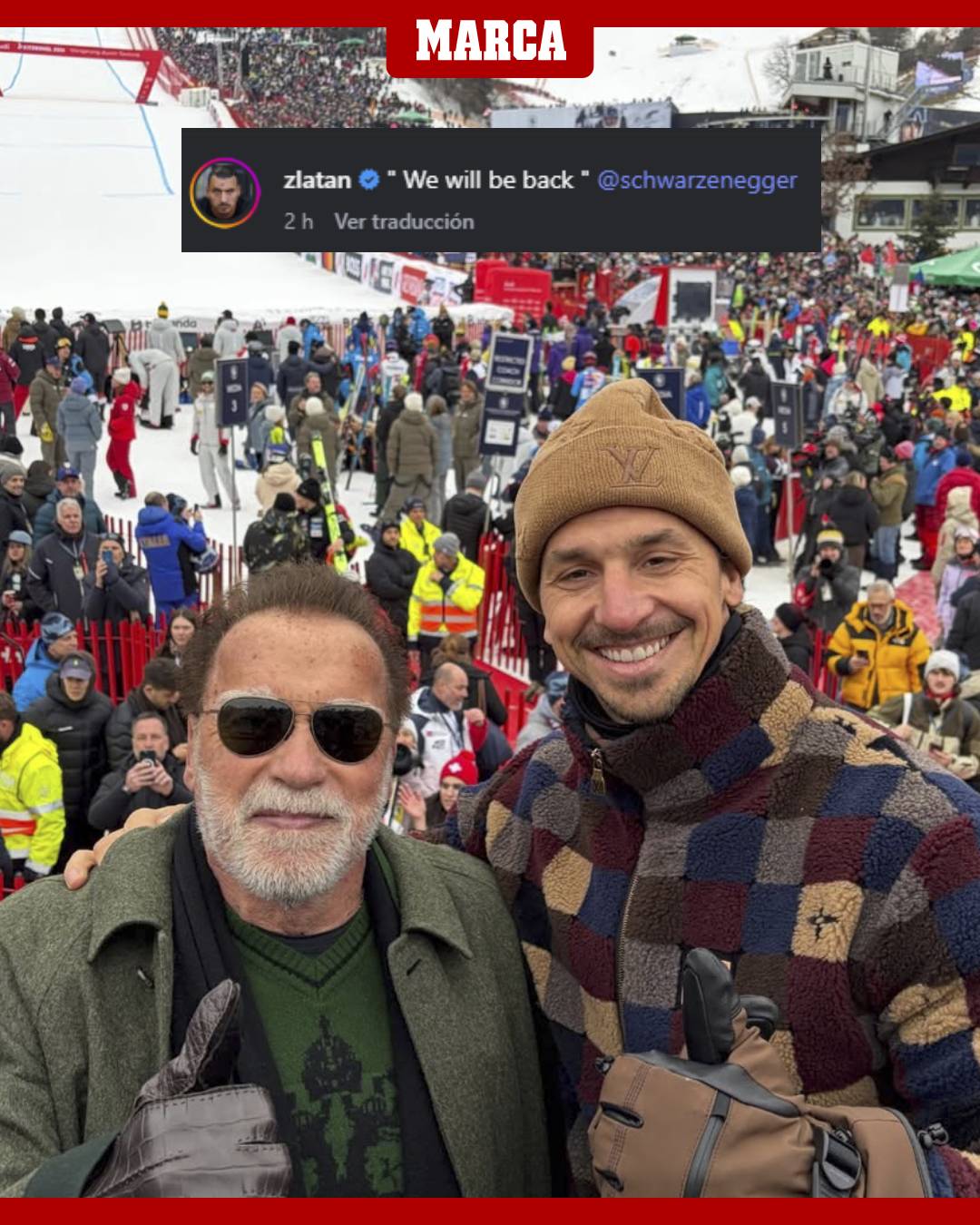 虎扑01月25日讯马卡报的官推更新,瑞典球星伊布拉希莫维奇和著名影星施瓦辛格一起滑雪,并发社媒“Wewillbeback”@schwarzenegger.