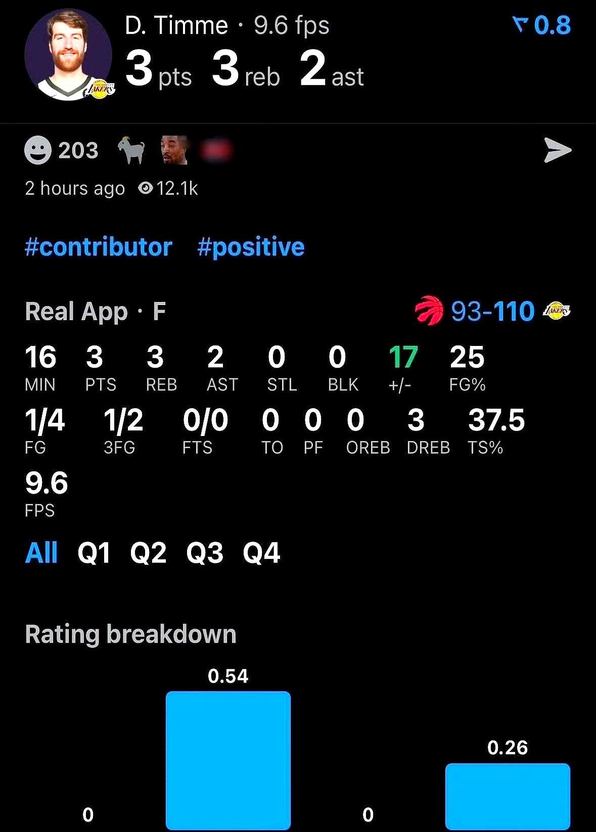 一份双向合同,竟打出了千万年薪的效果。 说的就是湖人队的德鲁·蒂米,一个随时可能被裁掉的“临时工”。 你敢信吗?当千万年薪的球星在场上散步时,是这个年轻人,用一场12投9中、爆砍21分的比赛,硬生生把球队从悬崖边上往回拽。 更离谱的是,他不上场湖人输球,他一上场,哪怕一分不得,球队都能赢。数据不会骗人,全队最高的正负值,就是他价值的最好证明。 他从不贪功,不跟巨头抢球权。你知道他在场上做什么吗?拼命地跑位、卡位,为队友拉开投篮空间,干着最累最脏的活,没有一句怨言。 主教练雷迪克直接被打服了,公开说自己被“震撼”到。在湖人队一片死寂的更衣室里,蒂米成了唯一的光。 这不就是下一个里夫斯吗?佩林卡,全联盟的眼睛可都盯着呢。 有的人拿着顶薪混日子,有的人拿着底薪在玩命。