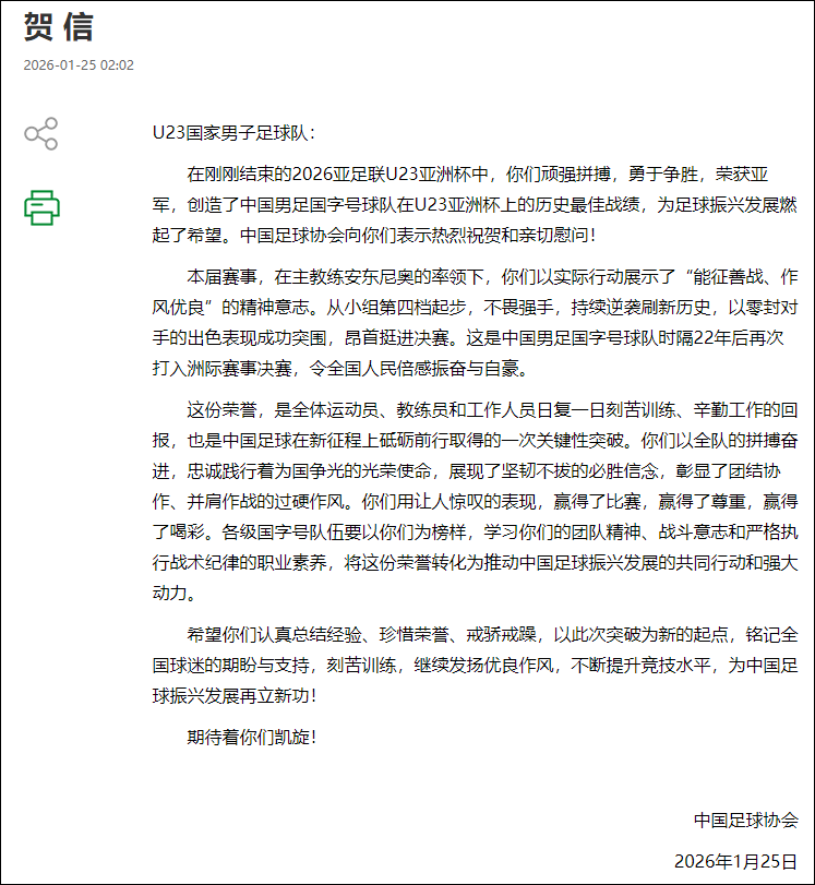 在刚刚结束的2026亚足联U23亚洲杯中,你们顽强拼搏,勇于争胜,荣获亚军,创造了中国男足国字号球队在U23亚洲杯上的历史最佳战绩,为足球振兴发展燃起了希望。中国足球协会向你们表示热烈祝贺和亲切慰问!