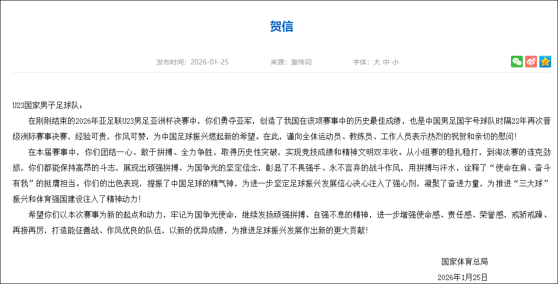国家体育总局在贺信中表示,U23国足勇夺亚军,创造了我国在该项赛事中的历史最佳成绩,也是中国男足国字号球队时隔22年再次晋级洲际赛事决赛,经验可贵,作风可赞,为中国足球振兴燃起新的希望。内容如下: