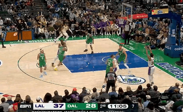 第二节比赛中,克莱两罚不中、斯马特底角三分投进,湖人领先独行侠12分。