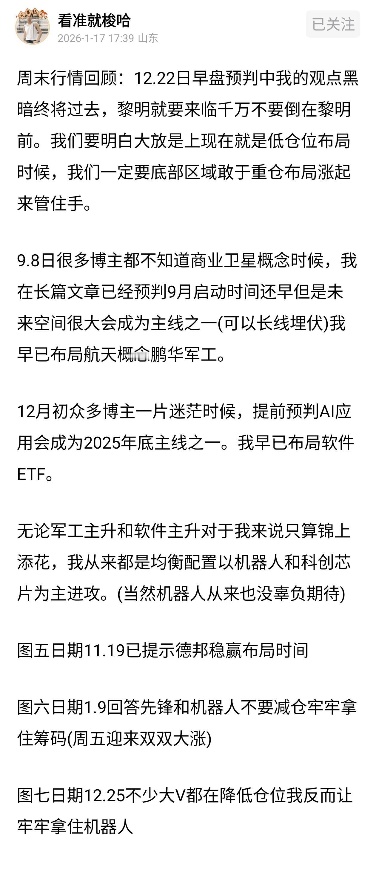 周末行情回顾:2026年十五五开局之年的1月份对于重仓科技板块朋友们收获满满,更是在12月份我们重仓布局牢牢拿住筹码的奖励。周五对鹏华军工(航天概念)进行减仓1/2操作,鹏华军工连续反弹已接近新高附近。8.25当时不少新粉丝不知道我看好板块我在评论区更新好几次。(因审核严格当时文章不让更新板块机会) 无论军工主升和软件AI应用主升对于我来说只算锦上添花,我从来都是均衡配置以机器人和科创芯片为主进攻。(能拿到主升浪无非就是看的远拿的住) 市场里的规律永远是:追热点的人赚一时的钱,提前布局的人赚一世的钱。股票的打板、基金的追涨,本质都是“零和博弈”,有人赚就有人亏(5次正确只要1次错误就会被套山顶);而提前配置、耐心等待,是“正和游戏”,赚的是企业成长、市场发展的钱,这才是普通人能抓住的机会。(我们在这个市场是投资而非投机)