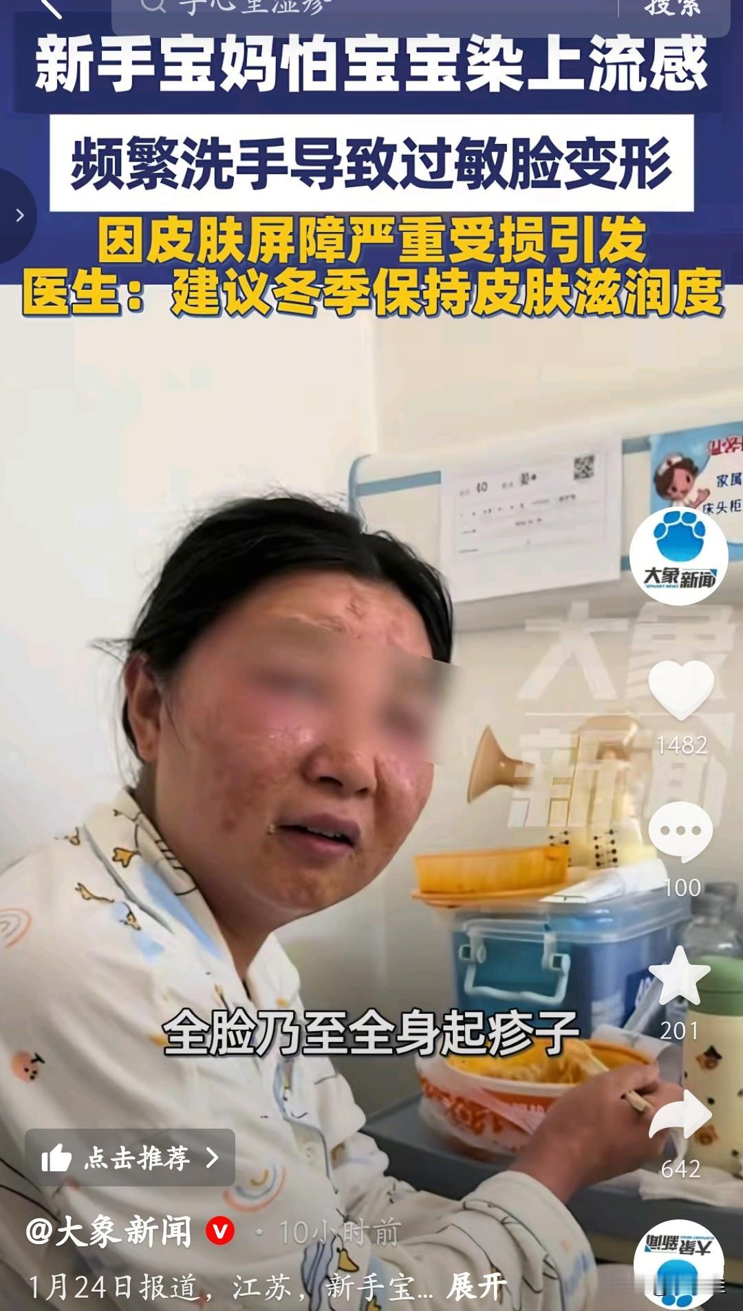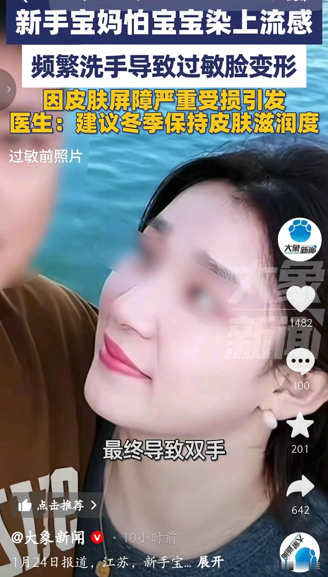 老话都说了,太干净反而容易生病,这位新手宝妈的经历就是活生生的例子。为了不让宝宝染上流感,她一天到晚不停地洗手消毒,结果皮肤屏障被彻底洗坏,不仅双手长满湿疹,还引发了严重过敏,整张脸肿得变了形,甚至全身都起了疹子。 看着她过敏前后的照片对比,真的让人心疼。医生也提醒,冬天天气干燥,皮肤本身就脆弱,过度清洁会把皮肤表面的保护膜洗掉,反而让病菌更容易入侵。 宝妈爱孩子的心完全能理解,但保护宝宝也得讲究科学,不用过度焦虑。勤洗手没错,但洗完及时涂护手霜、润肤霜,把皮肤的保护层补回来,才能真正守住健康防线。毕竟,妈妈健健康康的,才能更好地照顾宝宝呀。