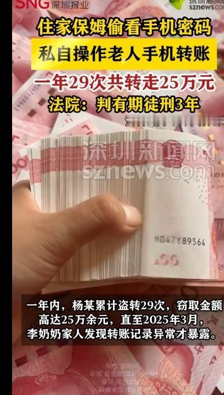 太气人了!深圳一位住家保姆杨某,在照顾独居老人李奶奶期间,偷看并记住了老人的手机支付密码,然后利用买菜、帮着网购的机会,在一年里偷偷转了29次账,卷走了25万余元的养老钱,每次转完还立刻删除记录,直到今年3月才被老人家人发现异常。 更让人心寒的是,老人把她当家人一样信任,她却把老人当成了提款机。 你要知道这是25万,不是25块,这一大笔钱,可能是老人一辈子省吃俭用攒下的养老钱,是老人生病、养老的救命钱,就这样被她一次次地掏空了。 最终,天理昭彰,报应不爽。深圳南山区法院审理后认为,杨某的行为已构成盗窃罪,判处有期徒刑3年,并处罚金。 网友们看完后评论道:“这哪是保姆,简直是家贼!老人的钱都敢偷,良心被狗吃了!” 也有的网友说:“一年时间作案29次!胆子未免太大了吧!而且,每次都在老人眼皮底下作案,想想都后怕。” 还有的网友说:“这种没有职业素养的行为必须重判!这种人不坐牢,以后还会害更多老人。” 其实,很多独居老人行动不便,对智能手机不熟悉,安全意识不强,这就给了别有用心的人可乘之机。 通过这件事也给所有的家庭敲响了警钟:请保姆时一定要多留个心眼,尤其是涉及到金钱和密码的时候,绝对不能掉以轻心。 我们常说“防人之心不可无”,但对老人来说,他们往往更愿意相信身边的人。 因此,做子女的,就应该抽空多陪陪老人,帮他们检查手机账单,教他们识别诈骗和盗窃的手段。毕竟,老人的安全感,需要子女守护。 (信息来源:深圳新闻网)