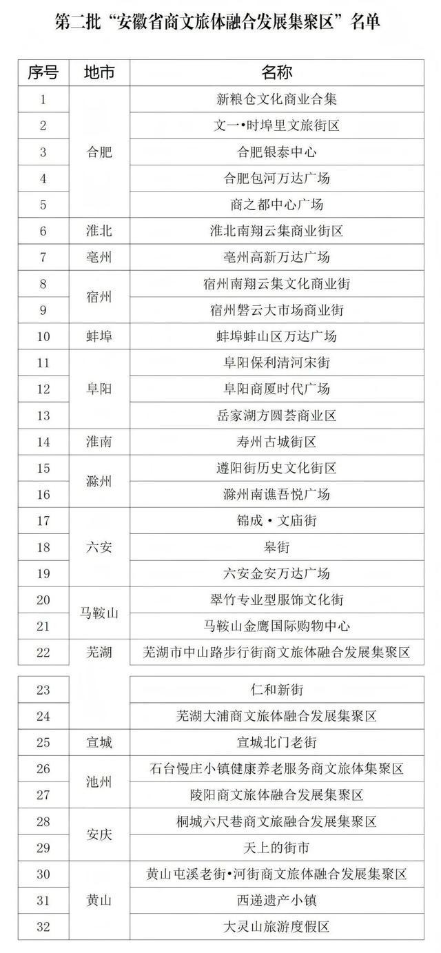 日前,安徽省商务厅联合省发展和改革委员会、省文化和旅游厅、省体育局,公布第二批“安徽省商文旅体融合发展集聚区”名单,全省共32家单位入选。(滑动查看详情)