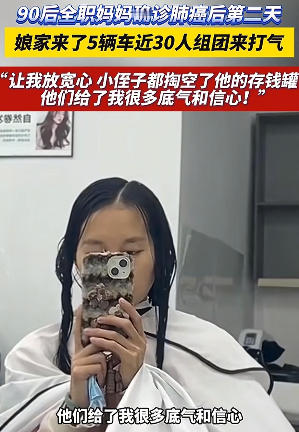贵州90后女子确诊肺癌,觉得天塌了,谁知转天让她热泪盈眶的一幕发生了,20公里外的娘家竟然来了5辆车共30人,组团为她打气。 女子是一名全职妈妈,在医院确诊肺癌后准备赴外省求医,想想要抛下孩子去面对未知的一切,女子绝望又难过。 谁知转天让她意想不到的一幕发生了,20公里外的娘家竟然来了5辆车,看到30个亲人陆续从车上下来,女子泪目了。 女子说,娘家除了一个上学的堂弟和一个上班的堂妹走不开,剩下的人全来了,包括因为晕车很少出门的大伯娘。 大家安慰女子放宽心,别担心钱的问题,还让婆家人把孩子带好。临走的时候,大家纷纷往她手里塞钱,连调皮的小侄子都把存钱罐里的钱给了她。 娘家人的支持,让女子觉得温暖又有依靠,瞬间有了面对病痛的勇气,她说,以前不觉得什么,这刻才知道什么叫娘家人! 看到视频,很多网友感动泪目,有网友说,亲情高调了一次! 有网友说,关键时刻娘家人雪中送炭,这样团结的大家庭真让人羡慕! 不得不说,在突如其来的重大疾病面前,女子娘家如此大规模高效率的支持,是亲情最直接最感人的表达。 女子作为全职妈妈,经济上比较依赖婆家,娘家人的做法不但在经济上支持了女子,情感上提供了后盾,同时也向婆家人表明了态度,给了女子信心和底气。 亲情无价!当你面对人生风雨,孤单无助时,没有什么比“你不是一个人”的信念传达更温暖更珍贵,更能给你勇气了!