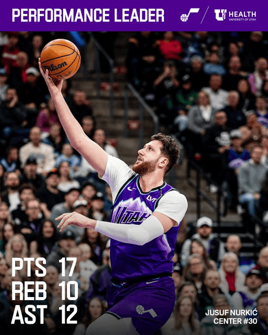 赛后,爵士官方发布努尔基奇数据海报,并配文道:“爵士队史首位连续三场砍下三双的球员。”