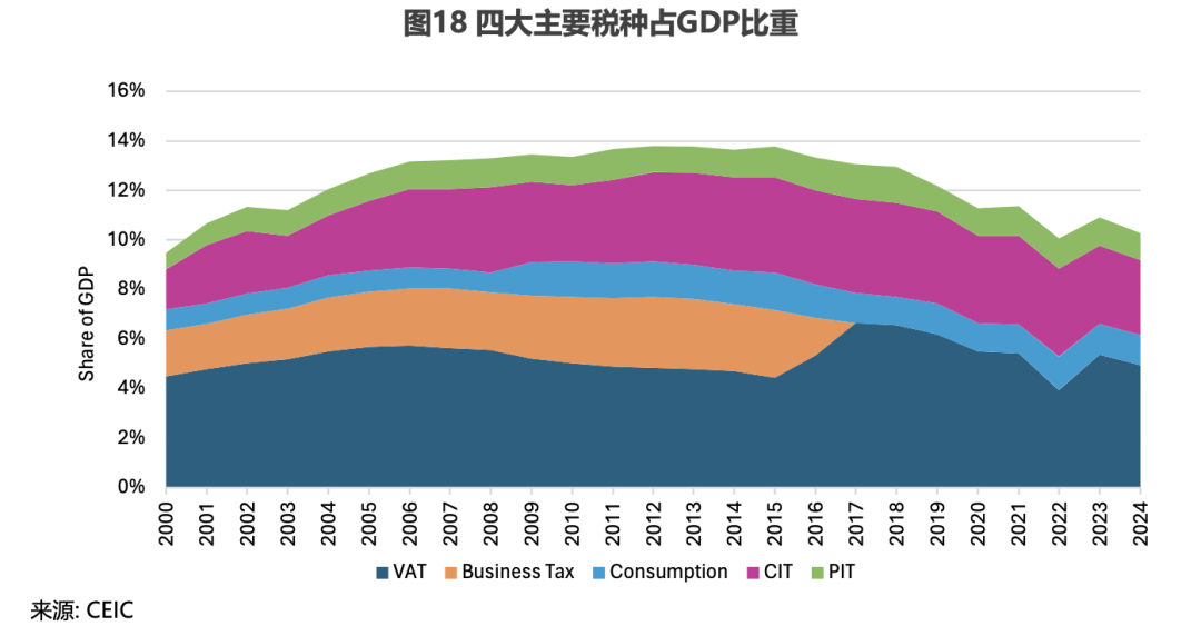 中国财政面临的核心挑战,在于财政收入基础持续受损。税收收入占GDP比重已大幅下降,从2012年的18.4%降至2025年的约12.5%,这既反映了税基侵蚀、反复减税的影响,也反映了疫情期间大规模纾困措施的影响。这一下滑趋势在四项最重要的税种中同样表现得十分明显(见图18)。而这一变化恰恰发生在社会支出需求明显上升之际,更加凸显了财税改革的紧迫性。