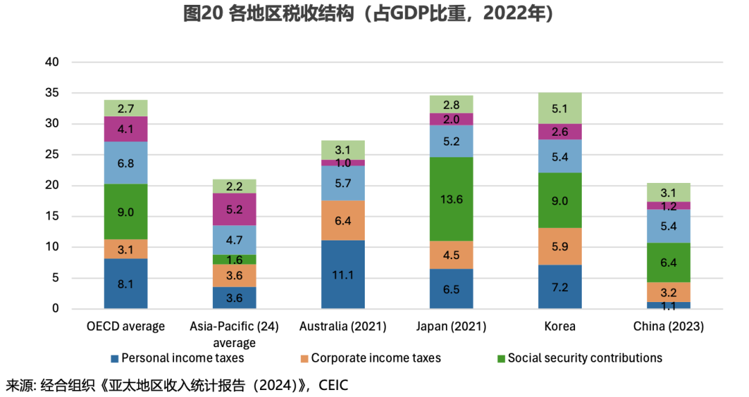 从增收角度看,个人所得税改革空间依然巨大。在各类主要税种中,个人所得税(PIT)是最突出的“例外”。2023年,中国个人所得税收入仅占GDP的1.1%(见图19),而经合组织(OECD)国家平均水平则超过GDP的8%(见图20)。这一结果并非源于征管能力不足,而主要是制度设计所致。