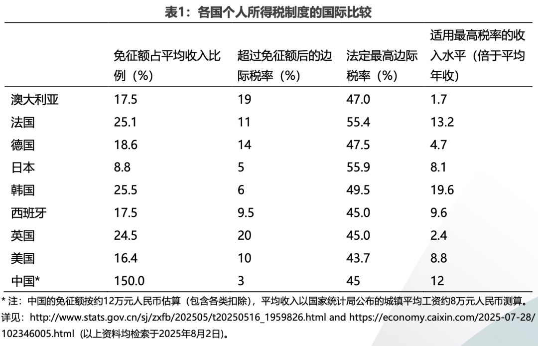 个税免征额的多次提高、广泛的专项扣除以及有限的征税覆盖面,显著侵蚀了个人所得税税基。目前个人所得税的实际免征水平约为每人每年12万元人民币,导致大多数劳动者无需缴纳个税,而在缴纳者中,超过60%仅适用3%的最低档边际税率。从国际比较看,中国的个税免征额相对于平均收入的比例异常之高,而具有实质调节意义的边际税率仅适用于极高收入群体(见表1)。