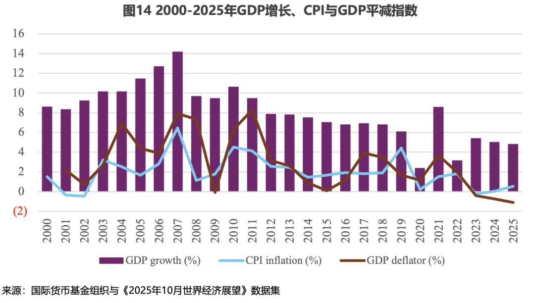 然而,相对改善掩盖了日益增长的绝对约束。全球需求再也不能像过去那样轻松吸纳中国日益扩大的工业产能,与此同时,国内需求也难以跟上。自2022年以来,这种紧张局势促成了持续的低通胀压力,尤其是在生产者层面,这指向的是过剩的供给而非周期性疲弱(见图14)。