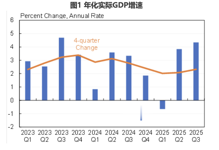 认为美国经济表现较好的解读主要关注的是GDP增速,其中2025年第三季度GDP以4.3%的年化速度增长,四个季度累计增长了2.3%(见图1)。此外,追踪估算表明,美国经济在第四季度也可能以类似的速度增长。