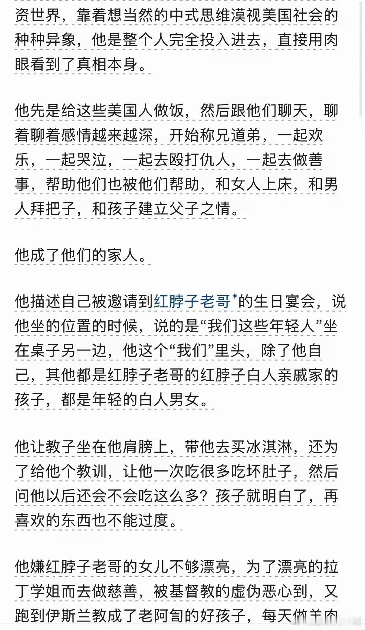 牢A:美国社会的“肉身探针” 斯奎奇大王(牢A)的视频很多时候并不提供直接证据,为什么仍有很多人无条件相信他?有个叫“烈月”的大V回答,把这事掰开了揉碎了,说得透彻极了。 牢A和那些动不动就“调查美国”的人压根不是一路人。他最开始到美国,没想着要探索社会运行机制,也没打算揭露什么黑暗面,就是单纯来上学、来生活的。他跟那些移民美国却融不进主流社会的“亚裔移民”也不一样,他没有把自己当成“异国人”,没有那种“外来者”的自觉。当他决定在这里生活、在这里过日子,他就跟在中国一样,很自然地开始和老师搞好关系,交各种朋友,撩各种女人。在这个过程中,他和他们建立了极其深刻的关系。 这就好比你去一个陌生的城市,不是拿着地图打卡景点,而是直接住进当地人家,跟他们一起吃喝拉撒,一起喜怒哀乐。牢A就是这么干的。他给那些美国人做饭,跟他们聊天,聊着聊着感情深了,就开始称兄道弟,一起欢乐,一起哭泣,一起去殴打仇人,一起去做慈善,帮助他们也被他们帮助,和女人上床,和男人拜把子,和孩子建立父子之情。在这个过程中,他跟他们建立了极其深刻的关系,他成了他们的家人。 他描述自己被邀请到“红脖子老哥”的生日宴会,说他坐的位置时,说的是“我们这些年轻人”坐在桌子另一边,他这个“我们”里头,除了他自己,其他都是红脖子老哥的红脖子白人亲戚家的孩子,都是年轻的白人男女。他让教子坐在他肩膀上,带他去买冰淇淋,还为了给他个教训,让他一次吃很多坏肚子,然后问他以后还会不会吃这么多?孩子就明白了,再喜欢的东西也不能过度。他嫌红脖子老哥的女儿不够漂亮,为了漂亮的拉丁学姐而去做慈善,被基督教的虚伪恶心到,又跑到伊斯兰教成了老阿訇的好孩子,每天做羊肉给他们吃。 为什么他不提供直接证据,却有人无条件相信他?就是因为,他不是像vv他们那样走马观花地路过那些黑暗的街道,和美国人公事化社交,永远作为局外人在观察美国社会,也不是像普通留学生和移民那样活在自己的小圈子里,更不像某些人靠着想当然的中式思维去漠视美国社会的种种异象。他是整个人完全投入进去,直接用肉眼看到了真相本身。 他先是在这个过程中,和那些普通人建立了极其深刻的关系,成了他们的家人。他经历的那些事,那些细节,那些情感交流,那些荒诞又真实的生活片段,是任何高明的视角和分析能力都探究不出来的,也是靠猜测编不出来的。我们信他,不是信他有什么确凿的证据,而是信他所描述的,是一个真实存在过、生活过、感受过的世界。他不是在揭露什么,他就是在讲他过日子的故事。而我们,就爱听这种带着烟火气、带着血肉的真实故事。因为我们从他的叙述里,看到了一个活生生的、不加滤镜的美国,看到了一个“正常人”在那个环境里会遇到的种种,这比任何新闻报道、任何调查报告都更有说服力。