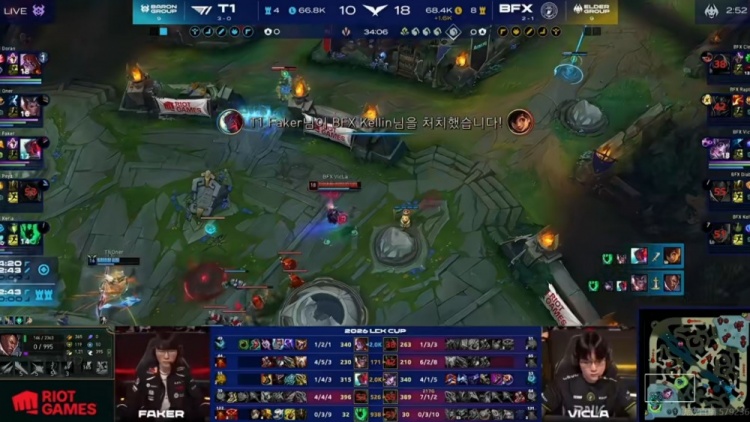 第二局3分钟Oner赵信gank下路,配合队友强杀Kellin米利欧拿下一血!7分钟T1下路拿到线杀,Raptor皇子则是gank中路击杀Faker永恩!BFX三人野区还强杀Oner赵信!1换2!随后9分钟Diable卢锡安卡6级配合米利欧强杀Peyz厄斐琉斯,同时中路河道Oner赵信也被抓,BFX再打一波0换2!回过头来中路Raptor皇子单切掉了Faker永恩!这几波连续节奏过后,BFX领先一千多了!