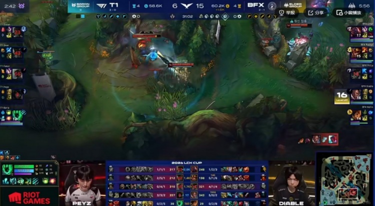 比赛进入中期,14分钟T1下路强动手,Diable卢锡安交闪躲过厄斐琉斯大招,Raptor皇子+VicLa辛德拉支援赶到反打将T1三人全部留住!BFX随后拿下先锋!再拆中一塔!