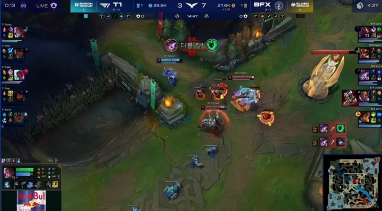 25分钟BFX收下听牌水龙,随后27分钟BFX牺牲Clear塞恩抱团拿下大龙!29分钟T1强开Diable卢锡安失败,正面Oner赵信倒下+双人残血,回头Raptor皇子没了但是河道团Diable卢锡安收割残局,T1抢龙魂失败中野倒下,BFX拿下水龙魂,拆掉T1中路高地!