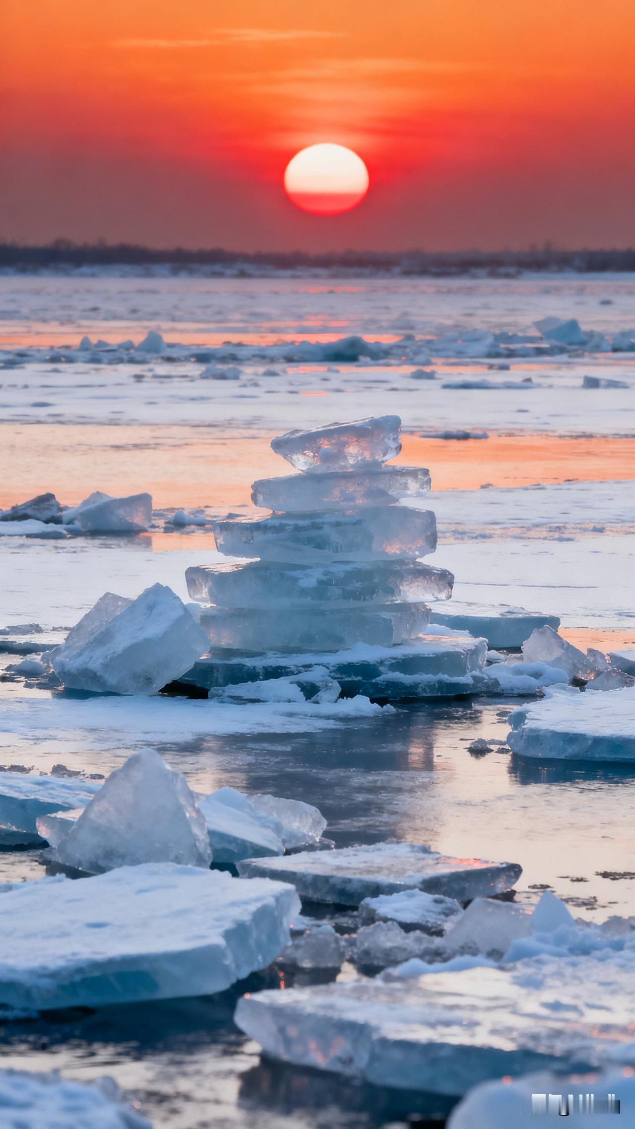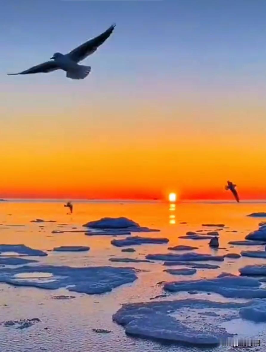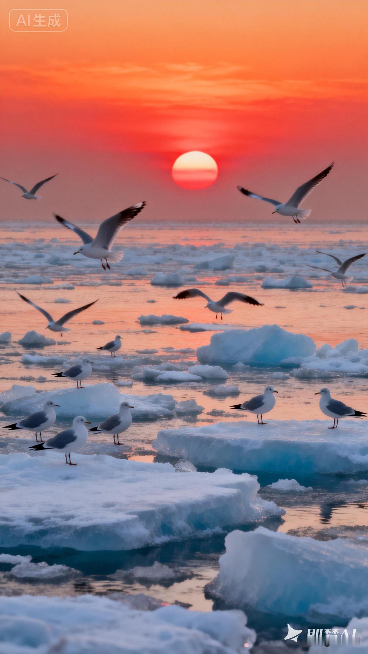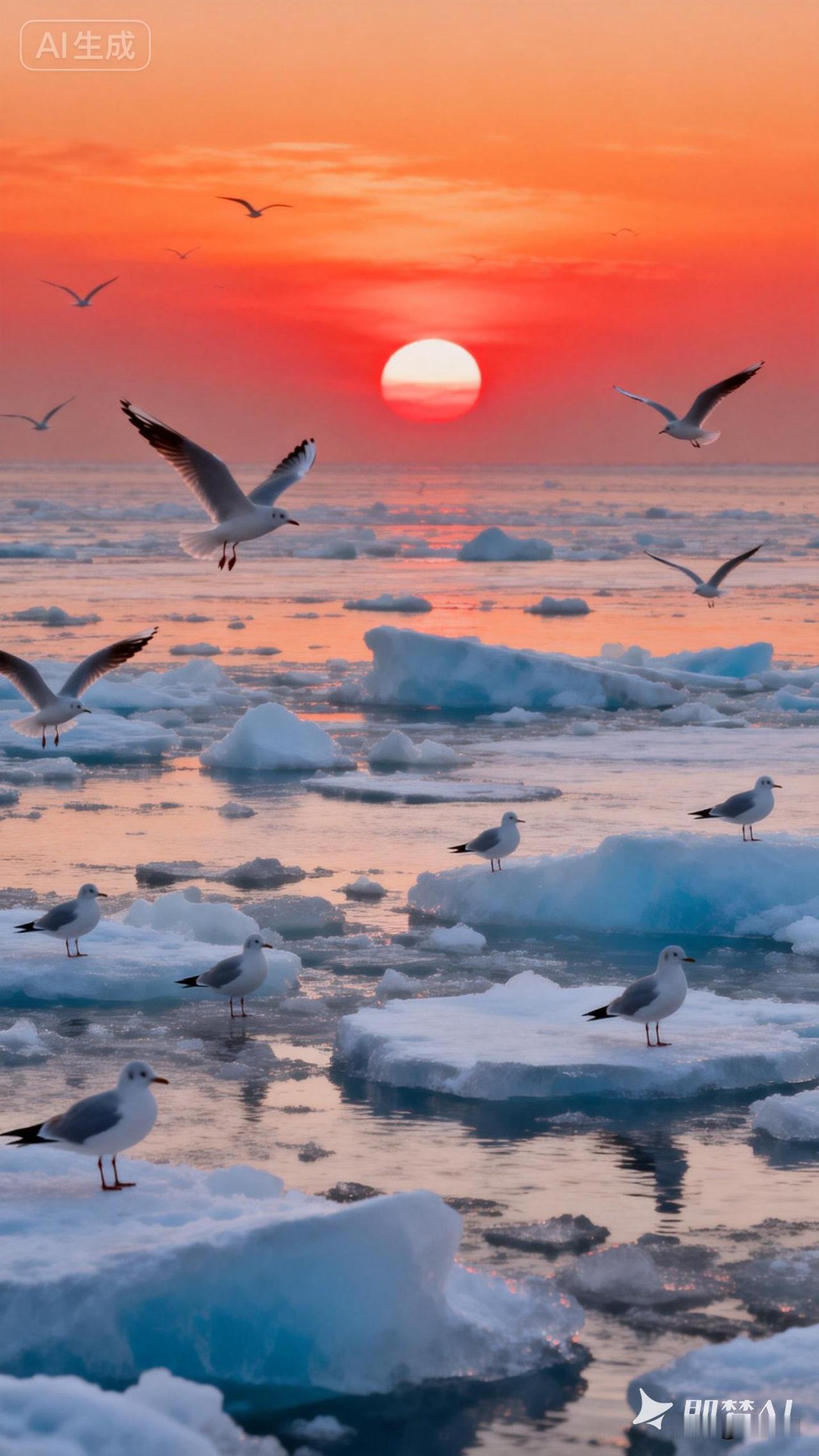 站在冰封的海岸,世界被劈成两半。脚下是蔓延至天际的蓝白色冰原,巨大的冰裂如银色闪电贯穿其中,浮冰以千万种姿态凝结——有的如破碎的琉璃,有的似沉睡的巨兽脊背。冰面并非死寂,细听有隐秘的咯吱声,那是冬日呼吸的节律。而抬头,天空正焚烧着另一场梦:夕阳如熟透的果实低垂,将云霭染成金橘、绯红与薰衣草紫的渐变绸缎,霞光泼洒下来,在冰的棱角上点燃细碎的火焰。 这极致的冷与极致的暖,在海鸥的羽翼间达成和解。它们或伫立冰礁如白色音符,或展翅掠过霞光,翅尖挑起金光又坠入冰蓝。它们的鸣叫清冽,刺破寂静却不打破宁静,反让这辽阔有了心跳。是的,这里没有“死亡”的寒冬,只有“沉静”的冬季。冰封不是终结,而是大地一场深沉的呼吸、一次透明的休眠。万物在简洁到极致的形态中——冰的棱线、光的斜度、鸟的轨迹——显露本质。 最深的治愈,或许就藏在这矛盾的和解中。寒冰让你清醒,落日予你温暖;寂静让你倾听自己,鸥鸣又提醒你与世界相连。当橙红、冰蓝与霜白在眼底交融,你明了:自然从不只有一面。它给你刺骨北风,就必在同一刻,赠你满天的炽热霞光作为补偿。而这,正是冬日最慷慨的浪漫——它允许万物在封存中积蓄力量,并在最凛冽的时刻,为你上演最壮丽的燃烧。