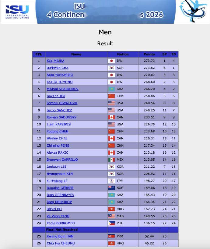 虎扑01月25日讯2026年国际滑联花样滑冰四大洲锦标赛男单比赛中,中国选手金博洋以自由滑169.40分,总成绩258.86分获第六,刷新短节目、自由滑、总成绩三项个人赛季最佳。