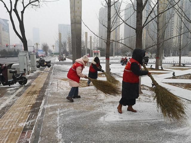“大爷,这边刚扫完,您绕过来走。”在环网巷,网格员张婕一边扫雪,一边提醒过往行人。住在恒大滨河左岸小区的周女士看到后,也拿着扫帚参与进来。她说:“大家一起干更有劲,效率也高。”