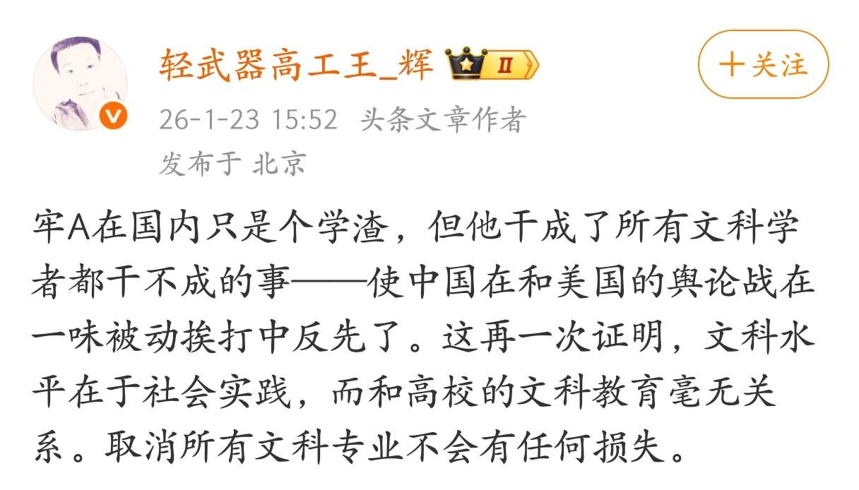 牢A的事情证明,文科水平在于社会实践,而和高校的文科教育毫无关系。取消所有文科专