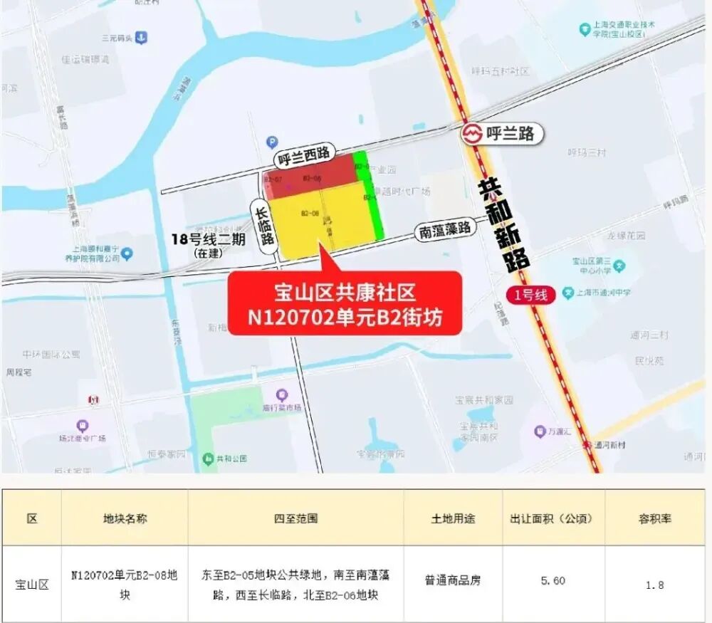 这宗编号为宝山区N120702单元B2-08的地块出让面积约5.6公顷,规划建筑面积超过10万平方米,容积率为1.8。这也是该板块时隔20年再次推出的市场化住宅用地。
