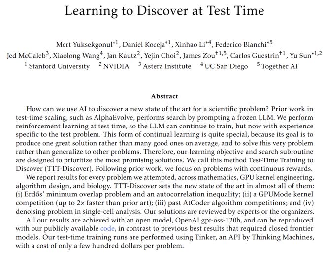 但就在本周,一篇名为《LearningtoDiscoveratTestTime》的论文横空出世,来自斯坦福大学和英伟达的研究团队提出了一种不仅「打草稿」,而且敢在考场上「现场长脑子」的新范式——TTT-Discover(Test-TimeTraining,测试时训练)。