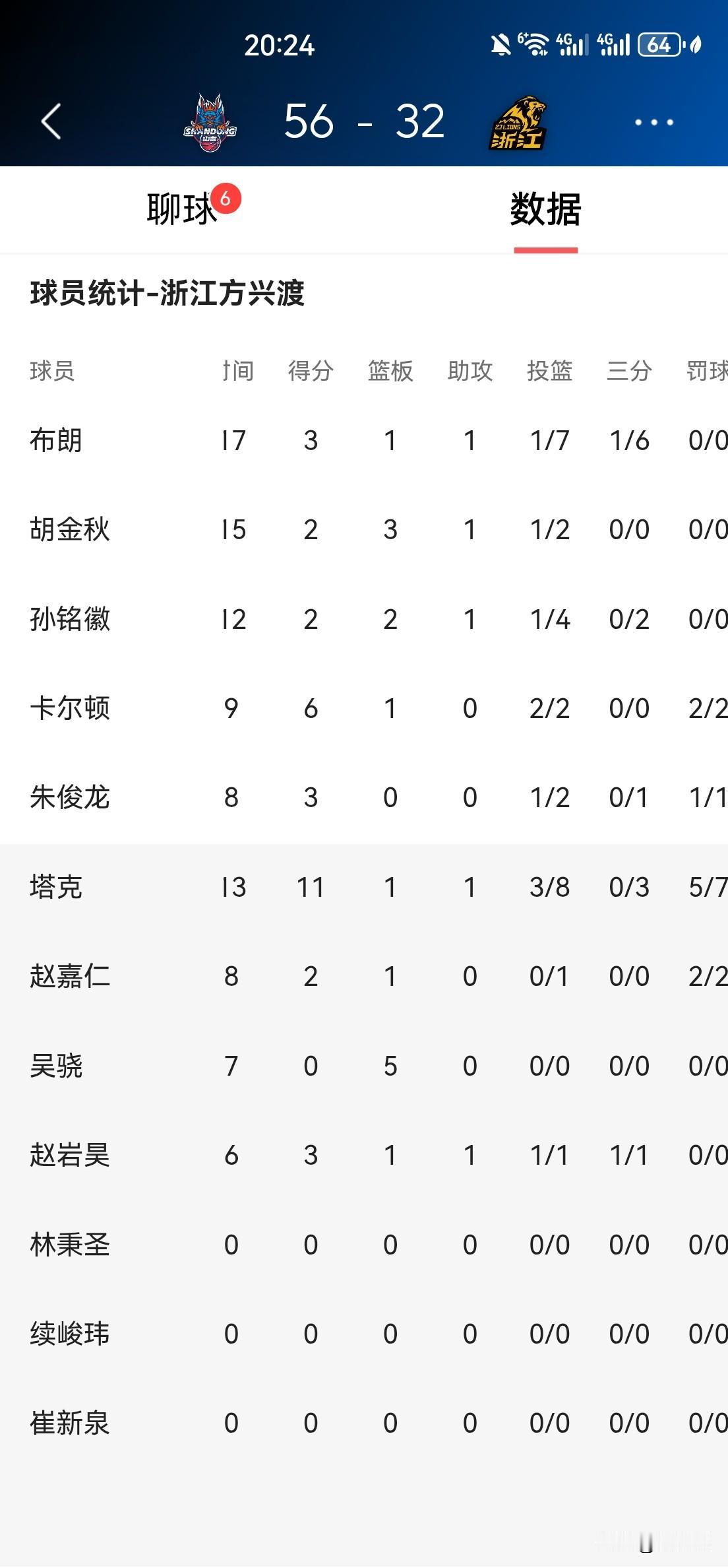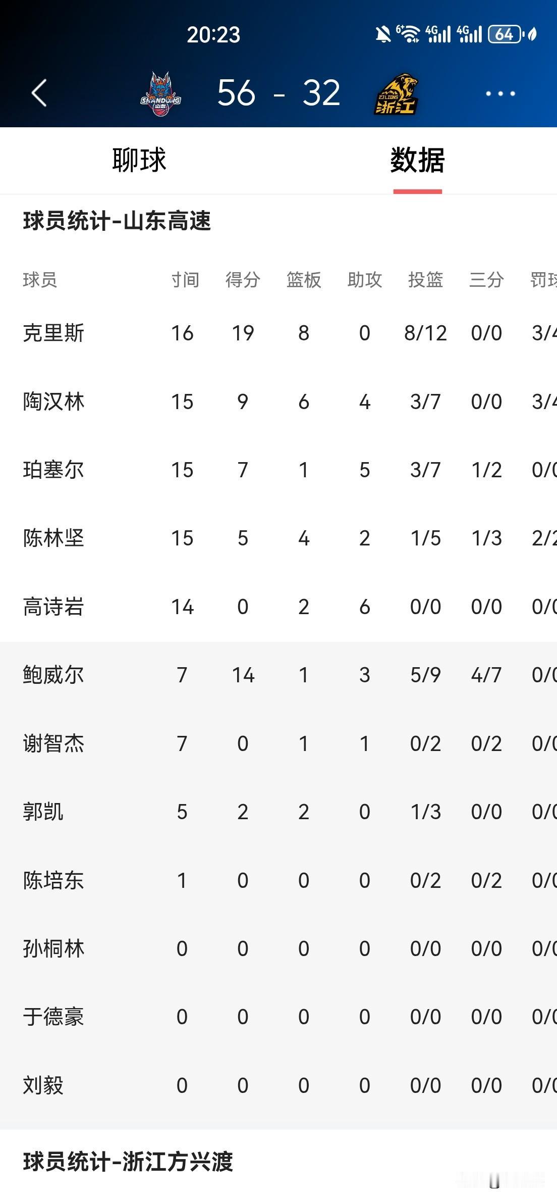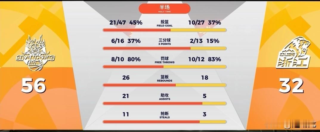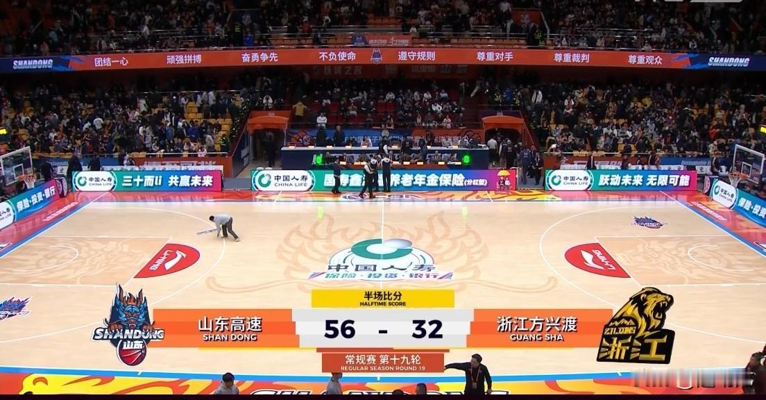山东爆冷斩落榜首广厦? 山东主场对阵广厦,半场结束,山东56:32领先广厦24分,第2节结束前,最大分差甚至被拉大到30分。 浙江广厦首发5人集体手感冰凉,半场合计仅拿到16分,全队仅替补塔克一人得分上双。孙铭徽半场比赛未结束便走进更衣室。 山东队克里斯、陶汉林、鲍威尔手感火热,分别砍下19分、9分、14分,强大的火力完全压制住浙江广厦。 山东队近11战赢下10场,状态火热,半场落后24分的榜首广厦,今天难逃一败。