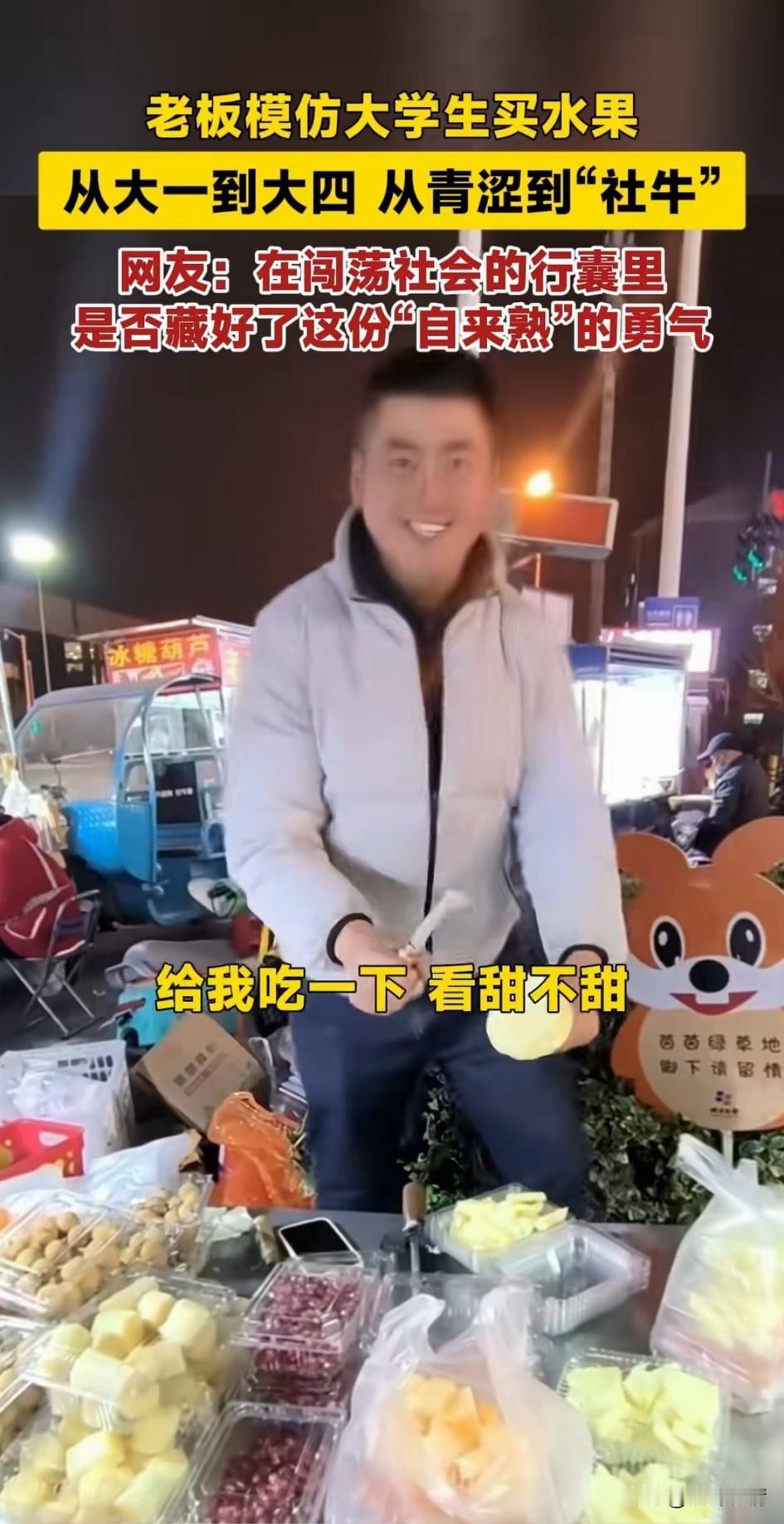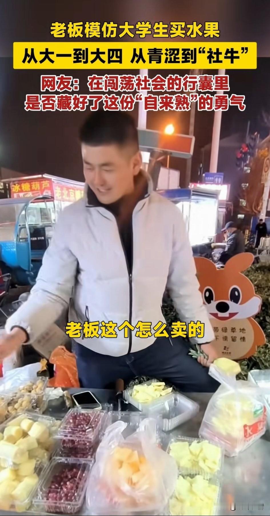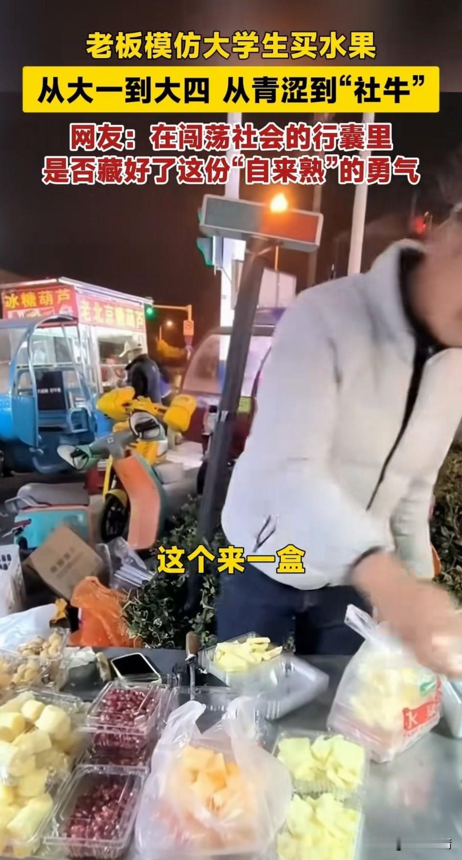 烟台大学城的老板模仿大学生买水果, 大一新生一般都是叔叔,这个水果怎么卖? 大二的学生一般都是老板,这个怎么卖的? 大三的学生一般都是这个、这个、这个来一盒! 大四的学生一般都是,老板,这个水果给我切一块,让我尝尝甜不甜! 可以说模仿的惟妙惟肖,一看这个卖水果的大哥就是老司机,接触的大学生很多了,就有了经验! 只要大学生来他的水果摊买水果,他就知道是大几的,然后他就对症下药,一一拿下! 会做生意的人就是这样,将生意做的非常的精,只有乐于观察客户的老板才是好老板! 老板的话也透露出了大学生从青涩到自来熟,这就是一个成长的过程,从学校的象牙塔过渡到了社会的皮囊! 大家对于这个老板模仿不同阶段学生买水果的样子怎么看? 山东 水果摊主 大学生卖果 烟台大学店 校园水果店