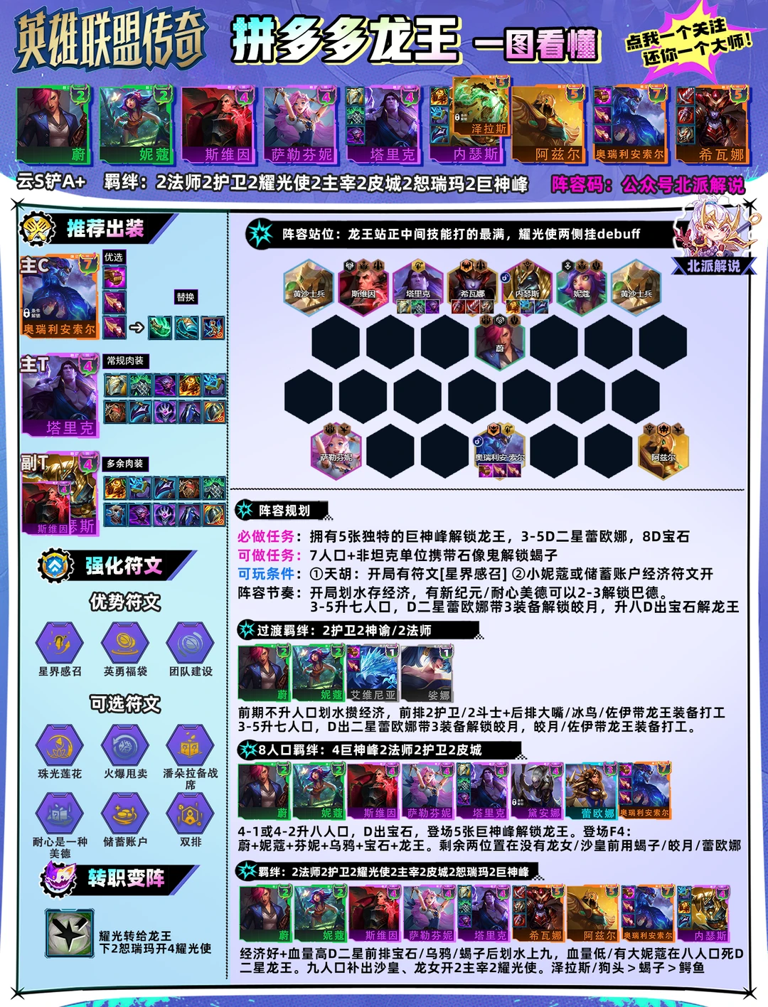 端>铲,龙王不像上版本的爆弹解锁出来1星就能锁两波,龙王刚解锁是0层被动没强度还要再掉血,只要补到二星前排+140层就很有实力了,能上九补出二星龙王=吃鸡,无限叠被动是成型上限最高的阵容。