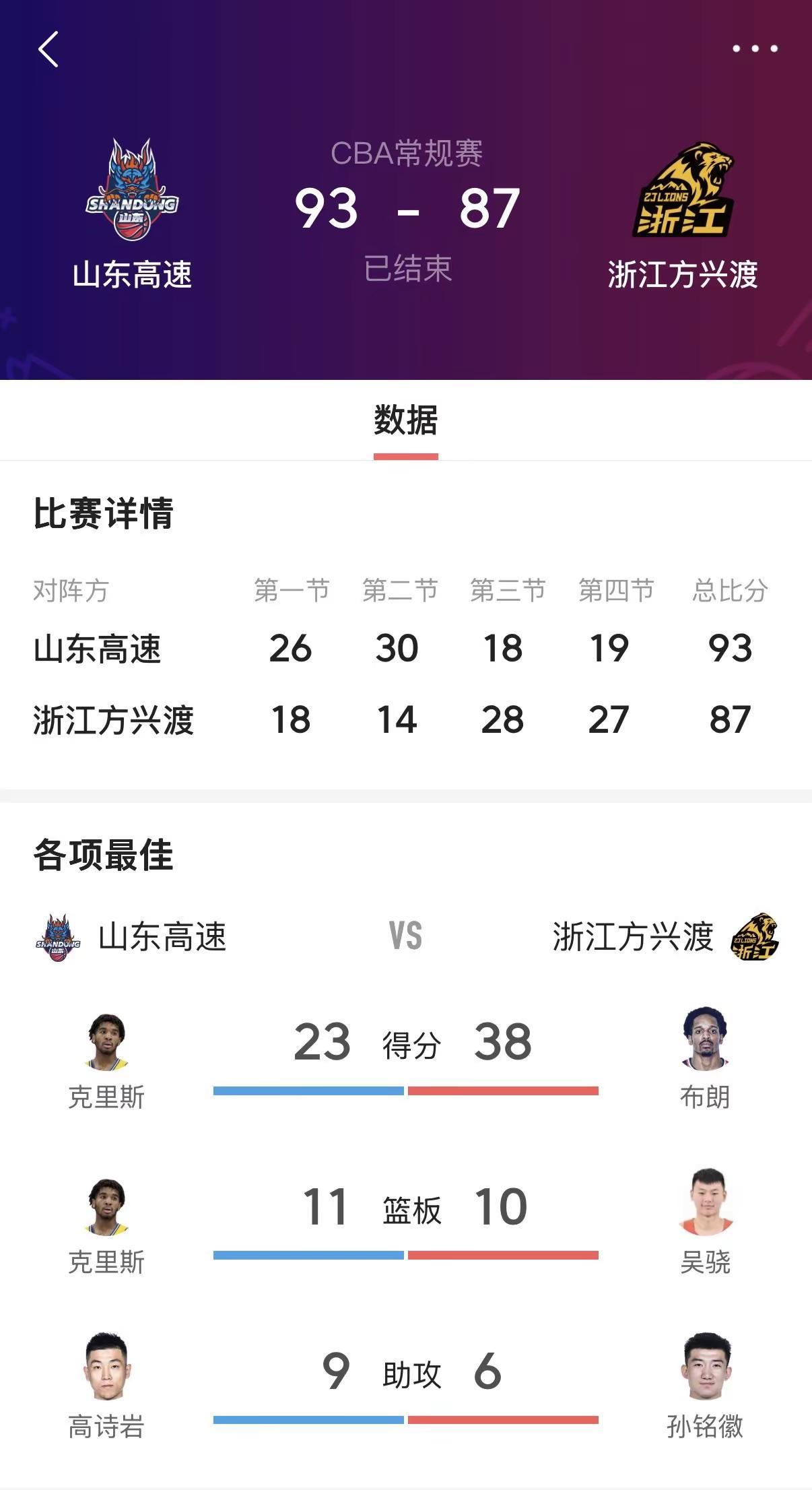 今日(1月25日)CBA常规赛全部战罢,多场爆冷,强队折戟。全场赛果速览(按关注度)• 新疆伊力特 78-59 辽宁本钢(辽宁末节仅4分,三分19中2,四连败)• 浙江稠州金租 85-82 上海久事(浙江末节逆转,终结三连败)• 山东高速 93-87 浙江广厦(广厦7连胜终结,布朗38分难救主)• 广州朗肽海本 80-78 青岛崂山啤酒(广州险胜,青岛三连败)新疆78-59辽宁:辽宁末节9分钟得分荒,单节仅4分;新疆劳森18分8篮板6助攻,吴冠希12分7篮板,防守锁死辽宁外线。2. 浙江85-82上海:张洪硕关键得分,兰道夫冲击内线;上海刘铮最后时刻反超未果,浙江险胜。3. 山东93-87广厦:山东首节26-18领先,第三节30-14拉开;布朗9记三分砍38分,陶汉林16分5篮板5助攻,克里斯23分11篮板4抢断。积分榜影响• 广厦仍居第一,上海第二,广东第三;• 深圳四连胜升至第五,山东三连胜第六;• 辽宁四连败跌至第13,跌出季后赛区。