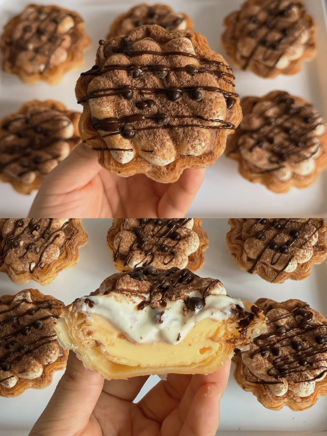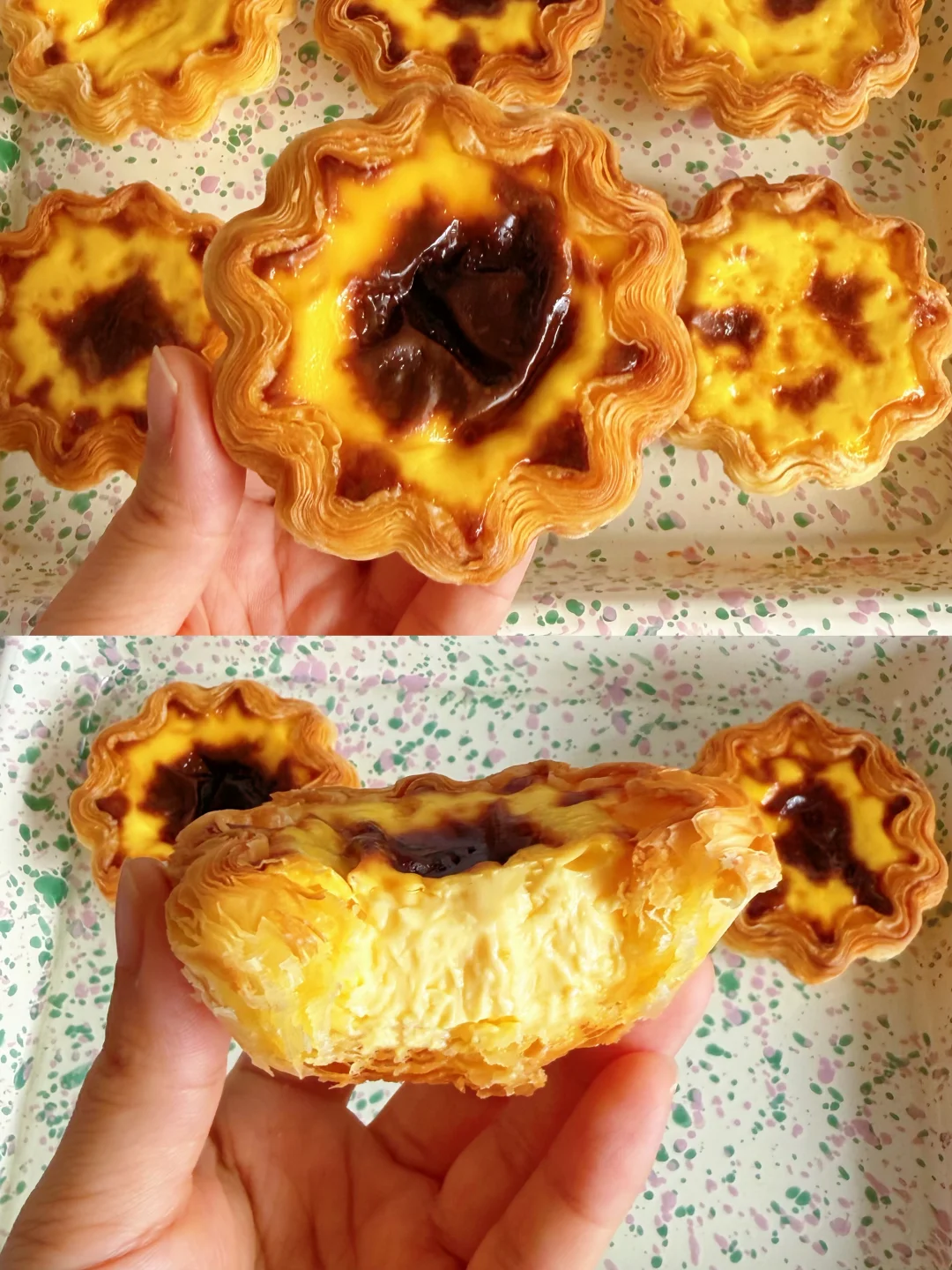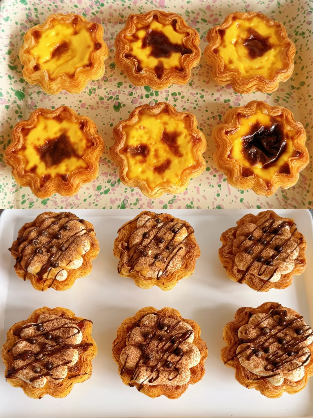 自己做的蛋挞比肯德基的还要好吃 做法很简单 大家一定要试试哦 💕蛋黄2个,全蛋1个,糖35克,炼乳15克,淡奶油180克,牛奶120克 1.所有材料混合均匀,过筛,倒入蛋挞皮9分满,烤箱上火220下火200烤25分钟 2.直接吃就很好吃了,我又打了一点奶油,筛了可可粉,撒巧克力豆,融化了一点巧克力做了点缀,发现居然更好吃了呢[害羞R]