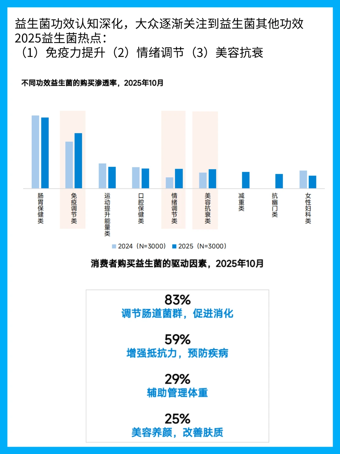 ▫️ 功效复合化(一菌多效,肠胃+免疫+美容)