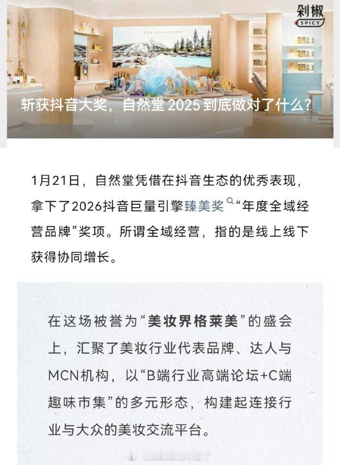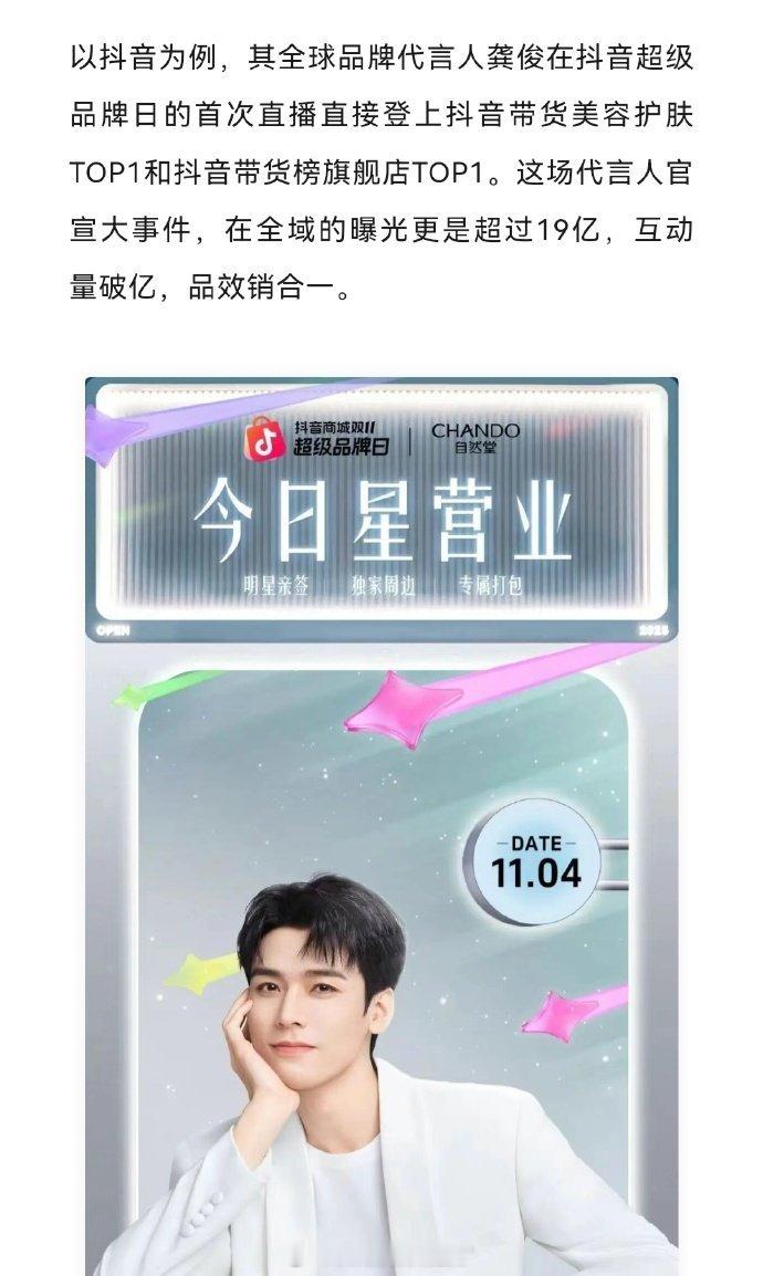 恭喜龚俊代言自然堂拿下2026🎶巨量引擎臻美奖年度全域经营品牌🎉🎉🎉特别表明,全球品牌代言人龚俊首次直播就登上美容护肤TOP1和带货榜旗舰店TOP1的双TOP!全域曝光超19亿,互动量破亿,品效销合一!达成了高曝光与人群沉淀效果,同比涨幅均在50%以上,呈现出了一份非常亮眼的成绩单!