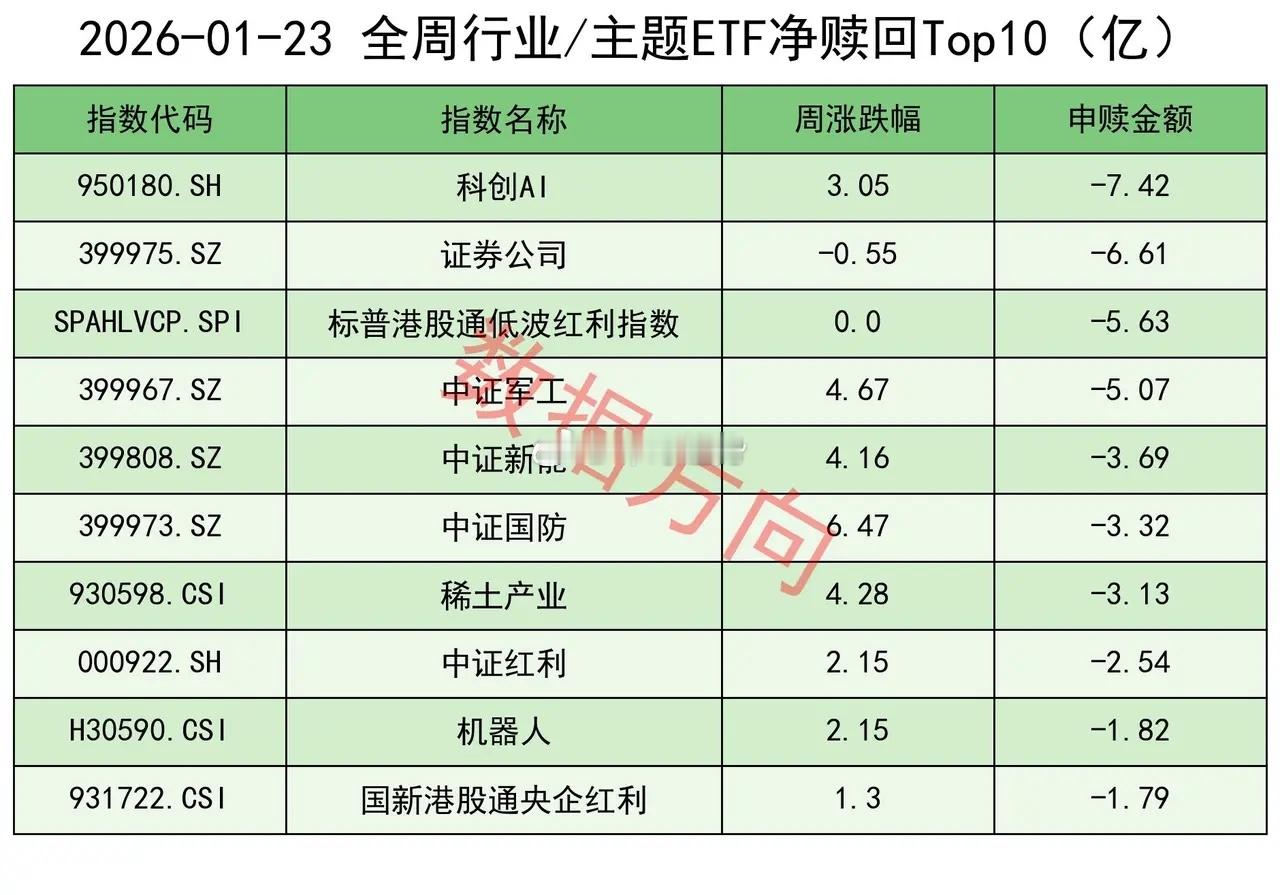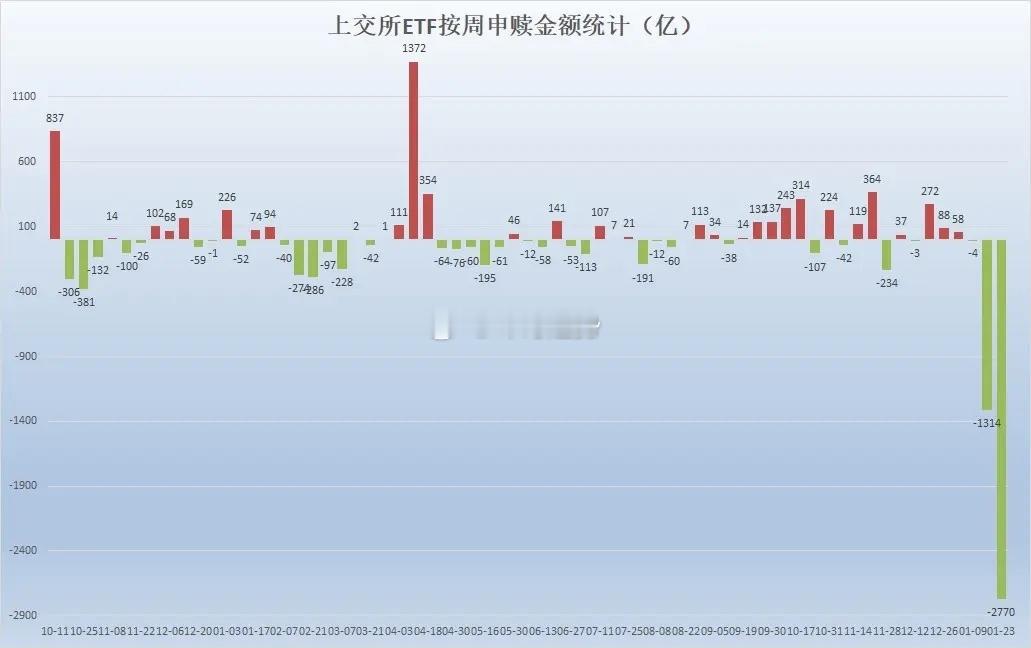 A股出了大事!上交所股票型ETF,在7个交易日内被大幅净赎回4084亿,如此强度绝无仅有。以前的时候,单周净赎回的最高纪录不到400亿,本次净赎回这么多,在整个A股的历史上都找不到可以参考的地方。只能用一个“反向”的例子作比较:上交所股票型ETF,于2023年11月20日到2024年2月8日,合计58个交易日里累计净申购3387亿。大盘于2024年2月5日那天见底2635点,随后开启一波上涨行情,一直涨到当年5月20日的3174点才告一段落,期间最高涨幅超过20%。和这一次相比,之前那次用了58个交易日,时间跨度更长;累计净申购额为3387亿,总体力度比这一次尚有距离。通过这种对比,大家应该能够感受到本轮净赎回的强度有多可怕。之前那一次,在大盘持续下跌的时候,数据方向反复强调的一个观点,这部分资金的进场成本大约在上证指数的2870点附近,所有接近、甚至低于这个点位的,都应该视为机会而不是风险。当时,虽然大盘最低下探至2635点,但是真正低于2870点的时间并不长。这一次,7个交易日净赎回4084亿,平均离场的价位大约在上证指数的4117点附近。如果上一次的规则仍然适用,则所有高于这个点位的,都应该视为风险而不是机会,需要仓控。换个角度再看,之前在2870点进场,今天在4117点离场,大资金用了不到两年时间,实现43%的收益,还是非常不错的。本文,对上交所股票型ETF本周的申购、赎回情况进行统计,以供参考。整体概况本周,上证指数涨幅0.84%,上交所股票型ETF净赎回2770.11亿,再创惊人纪录。以前单周净赎回的最高纪录只有380多亿,上周的1314亿是之前纪录的三倍还要多,本周的2770.11亿再次把上周的纪录翻了一倍。如果只是正常的低吸高抛、平抑市场波动,还勉强可以接受;就怕有一些不为人知的利空在前面等着。因为不知道究竟发生了什么事情,首先需要考虑做好防护,把风险控制在自己能够承受的范围以内。五个交易日全部大幅净赎回,依次分别为:(-349.37)亿、(-452.32)亿、(-808.15)亿、(-511.87)亿、(-648.39)亿。从各宽指的情况来看:沪深300,本周被大幅净赎回1908.64亿,金额非常大。其权重占比较高的金融、白酒等近期的走势都非常弱;中证1000、上证50,本周分别净赎回511.44亿、362.26亿;中证500、中证A500,本周分别净赎回97.49亿、60.65亿。上证180、上证指数,本周净赎回都在1亿以内。仅有科创100、科创创业50、中证A50等三个指数在本周获小幅净申购,金额都在1亿以内。行业和主题申购榜科创芯片、科创半导体材料设备、半导体材料设备三个指数,一起进入本周申购榜,合计净申购70.05亿;细分化工、有色金属、细分有色、SSH黄金股票,一起进入本周申购榜,合计净申购98.55亿赎回榜中证军工、中证国防,一起进入本周赎回榜,合计净赎回8.39亿;标普港股通低波红利指数、中证红利、国新港股通央企红利,一起进入本周赎回榜,合计净赎回9.96亿。ETF向太喊话李亚鹏放过自己