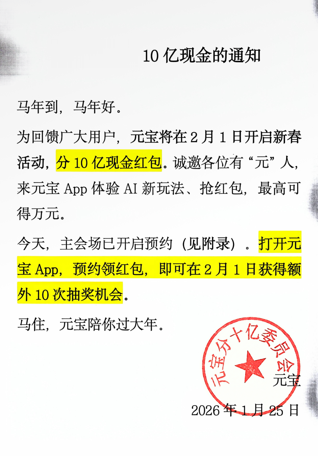 1月25日,腾讯官方发布《关于春节分10亿现金的通知》:将在2月1日上线春节活动,用户上元宝App分10亿元现金红包,单个红包金额可达万元。