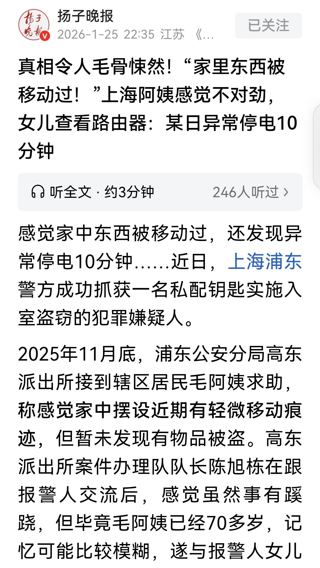 “真是防不胜防!”上海,一70岁大妈发现家里的摆设,被轻微移动过,但东西没丢,更蹊跷的是,女儿查看路由器,某日竟异常停电10分钟,但当天小区并无停电记录。大妈吓得报了警,她再一清点家里的财务,发现价值5000多的金币和金器不见了,小偷的真实身份惊呆众人。 2025年11月底,70岁的毛阿姨心急火燎报了警,言语中有掩盖不住的恐慌。 据毛阿姨说,她发现家里门窗完好无损,没有被撬的痕迹,但家里的摆设却被轻微移动过,这分明说明家里进小偷了,但奇怪的是,却没偷走任何东西。 毛阿姨害怕极了,她不知道这个入侵者什么目的,进自己家就像回家一样随便,如果自己睡到半夜,他进来了,岂不吓个半死? 于是毛阿姨决定报警,但帽子叔叔听了也觉得蹊跷,但他们觉得贼不走空,小偷入室不盗窃,太不合常理了。 所以,帽子叔叔怀疑是毛阿姨太多疑了,毕竟她古稀之年了,可能家里的东西她自己挪动后给忘了,感觉有人进了自己的家。 于是,帽子叔叔跟毛阿姨的女儿王女士联系了,让她确认一下家里到底有没有异常情况。 结果王女士还真发现了不对劲,她查看家里的路由器,发现11月27日这天,在小区没停电的情况下,她家竟然断电了10分钟。 这说明家里确实进来陌生人了,对方发现家里安了监控,所以拉闸断电,实施盗窃,10分钟的时间,不可能没损失财务。 于是,母女俩又重新清点家里的财务,发现一套熊猫纪念金币和一个金器不见了,价值50000多。 既然门窗没损坏,帽子叔叔怀疑是熟人作案,通过钥匙打开的入户门,于是,调取周边监控,锁定了犯罪嫌疑人丁某某。 2026年1月,丁某某被抓获,可他拒不承认犯罪事实,只承认2025年9月,通过给毛阿姨换入户门时,偷配了钥匙,但进了她家,没偷东西。 真是不见棺材不落泪呀,随后,帽子叔叔查看了丁某某的银行流水,发现有2025年9月后,他和不同金店,有3笔交易,一共获利58200元。 丁某某一看不交代不行了,就供认不讳了,毛阿姨这才知道,他一共偷偷潜入自己家2次了,真是后怕呀。 目前,丁某某因涉嫌盗窃被刑事拘留,案件正在进一步办理中。 这个太狡猾,一般人肯定以为自己哪里搞错了,做一个生活中的有心人,事事留意,处处小心发现异常,果断处置,避免损失,心里踏实。 防不胜防,你家的电表就在楼道里,能随意关闭你家电源,一切科技都玩完。 这小偷丁某某的操作真是让人细思极恐!先借换门偷配钥匙,之后两次潜入毛阿姨家,第一次没偷东西估计是在踩点,第二次拉闸断电破坏监控再盗窃,心思缜密又狡猾。 毛阿姨一开始发现家里摆设移动,警察还以为是她多疑,谁能想到背后藏着这么大个隐患。 这也给咱们提了个醒,熟人作案往往更难防范,平时对身边那些看似老实巴交、有接触家里机会的人,也不能完全放松警惕。 而且家里装监控也不一定就万无一失,像这种能随意关闭电源破坏监控的,防不胜防。 好在帽子叔叔没放弃调查,通过银行流水找到了关键证据,让丁某某原形毕露。 咱们生活中真得多留个心眼,发现异常别犹豫,赶紧报警,把损失扼杀在摇篮里,不然像毛阿姨这样,东西丢了才反应过来,那可就糟心啦。 对此,你怎么看?