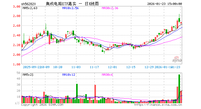1月23日,集成电路ETF嘉实(562820)跌0.26%,成交额5282.09万元。当日份额减少200.00万份,最新份额为8813.60万份,近20个交易日份额增加3400.00万份。最新资产净值计算值为2.35亿元。