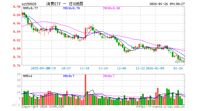 1月26日,消费ETF(159928)开盘跌0.13%,报0.770元。消费ETF(159928)重仓股方面,伊利股份开盘涨0.04%,贵州茅台涨0.26%,牧原股份跌0.02%,五粮液跌0.03%,温氏股份涨0.00%,泸州老窖涨0.02%,山西汾酒跌0.04%,海天味业跌0.03%,东鹏饮料跌0.14%,海大集团涨0.49%。