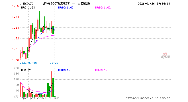 1月26日,沪深300指增ETF(562070)开盘涨0.00%,报1.024元。沪深300指增ETF(562070)重仓股方面,宁德时代开盘涨1.45%,贵州茅台涨0.26%,中国平安涨0.16%,紫金矿业涨3.14%,招商银行涨0.00%,兴业银行跌0.05%,中际旭创跌0.85%,新易盛跌0.84%,寒武纪跌0.75%,药明康德涨0.26%。