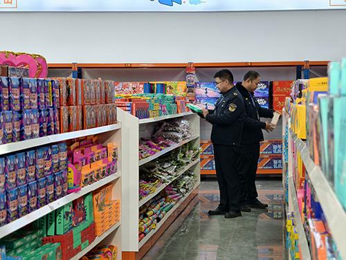 市应急局工作人员正在检查烟花爆竹零售店的产品情况。