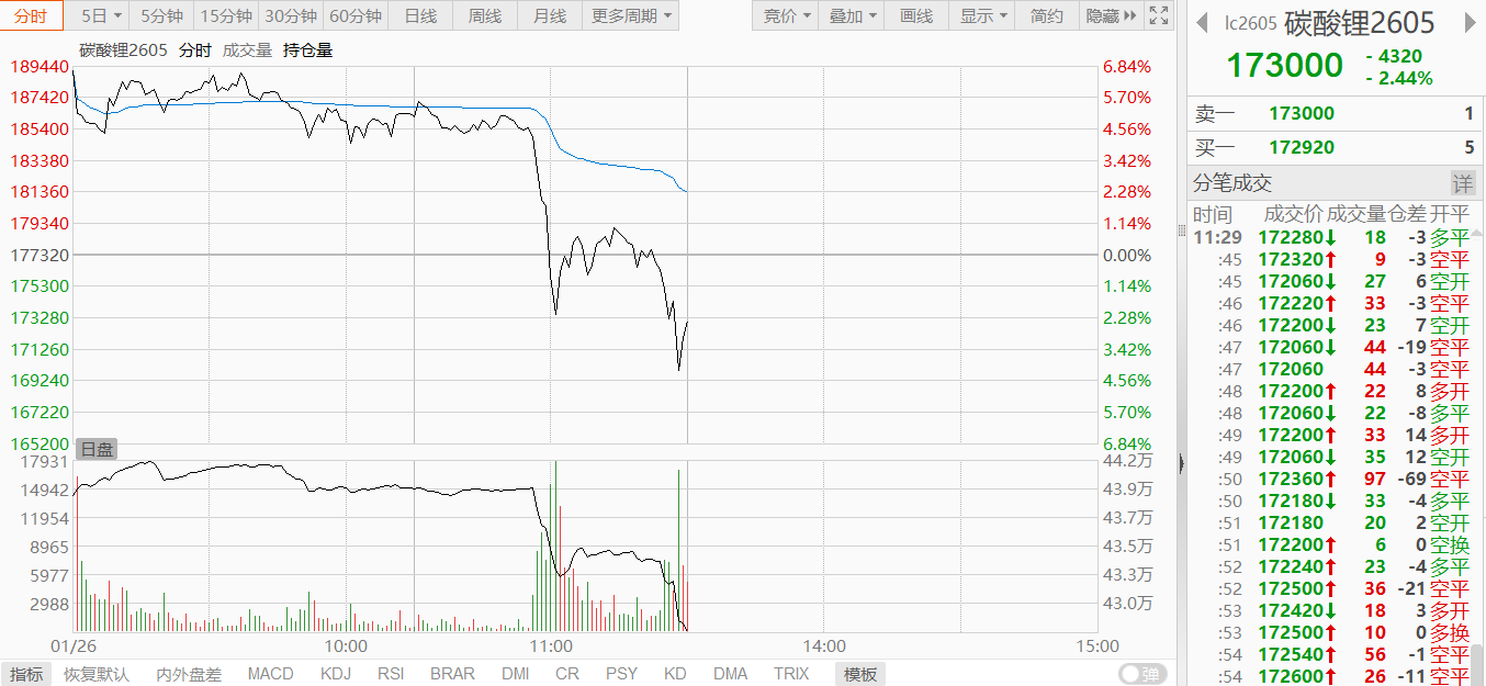 1月26日上午,碳酸锂期货主力合约碳酸锂2605盘中两度下杀,价格由涨转跌,截至中午收盘,碳酸锂2605下跌2.44%,报173000元/吨。