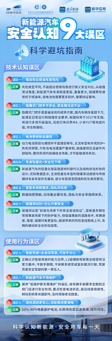 为凝聚科学共识、破除认知误区,《报告》系统归类并深入分析公众在新能源汽车安全领域的“技术认知”与“使用行为”两类典型误区,具体包括对“电动车安全”与“燃油车安全”的简单比较、对“隐藏式门把手”安全性的以偏概全、对“动力电池”受损即爆燃的必然性联想、对“车身材料”轻量化与安全性减弱的错误关联、对“车辆数据”隐私与行车安全的过度捆绑担忧、对“碰撞测试速度”与真实事故保护的混淆、对“智能驾驶”能力的过度期待与过度使用、对“低维护”特性的误解导致忽视定期安全检查、对“续航里程”与“充电安全”的焦虑混淆导致充电行为不安全等9大误区,结合最新技术标准与行业实证数据进行科学阐释,新能源汽车安全是系统工程,需基于其技术特性科学认知与规范使用,公众应了解电池、车身等安全设计,正确使用辅助驾驶并定期维护,行业需遵循安全标准,推动技术稳健演进。