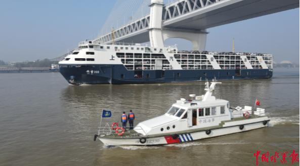 海事执法人员护航滚装船通过桥区水域。