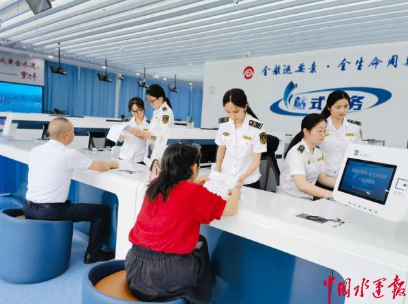 海事执法人员在长江(芜湖)航运要素大市场为行政相对人办理业务。