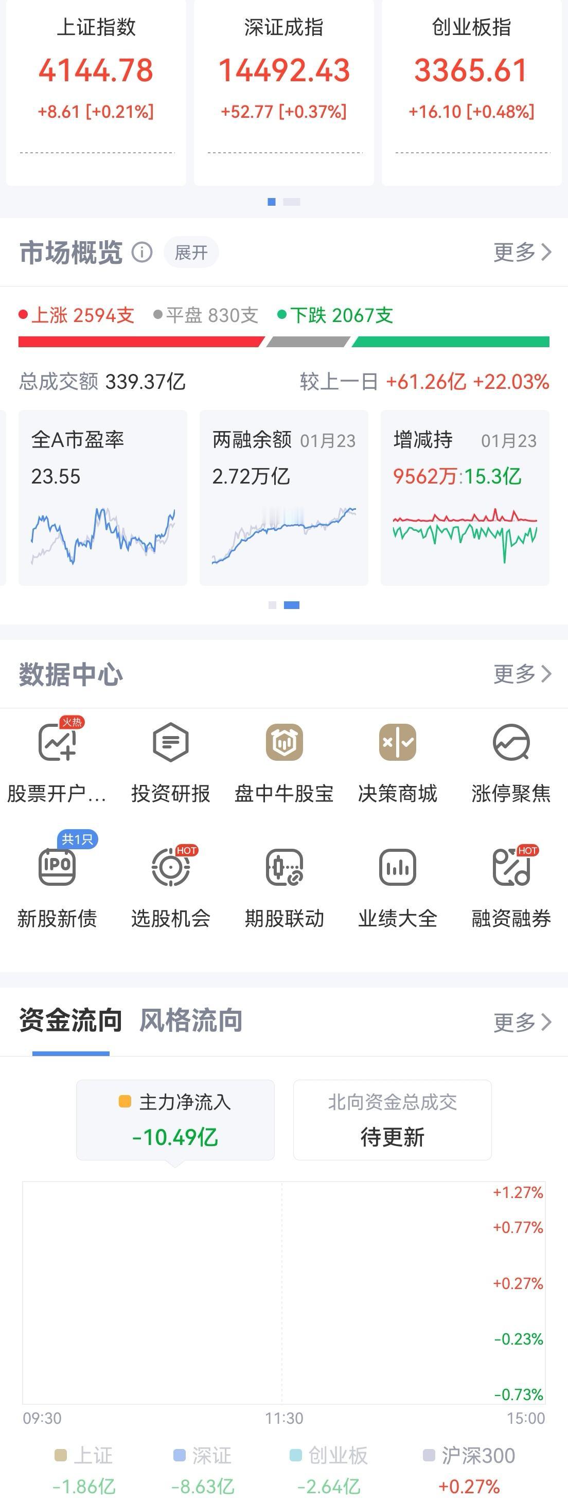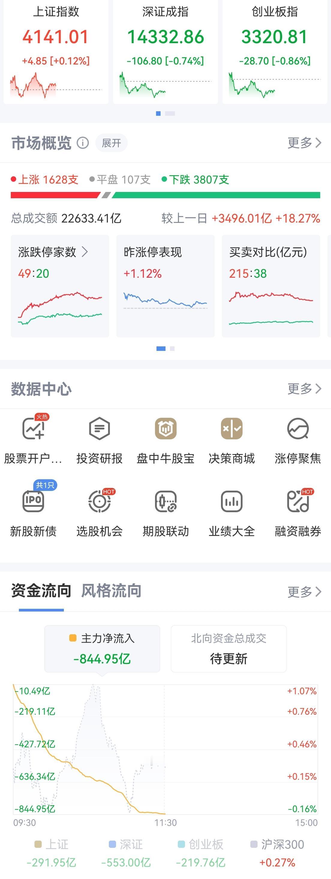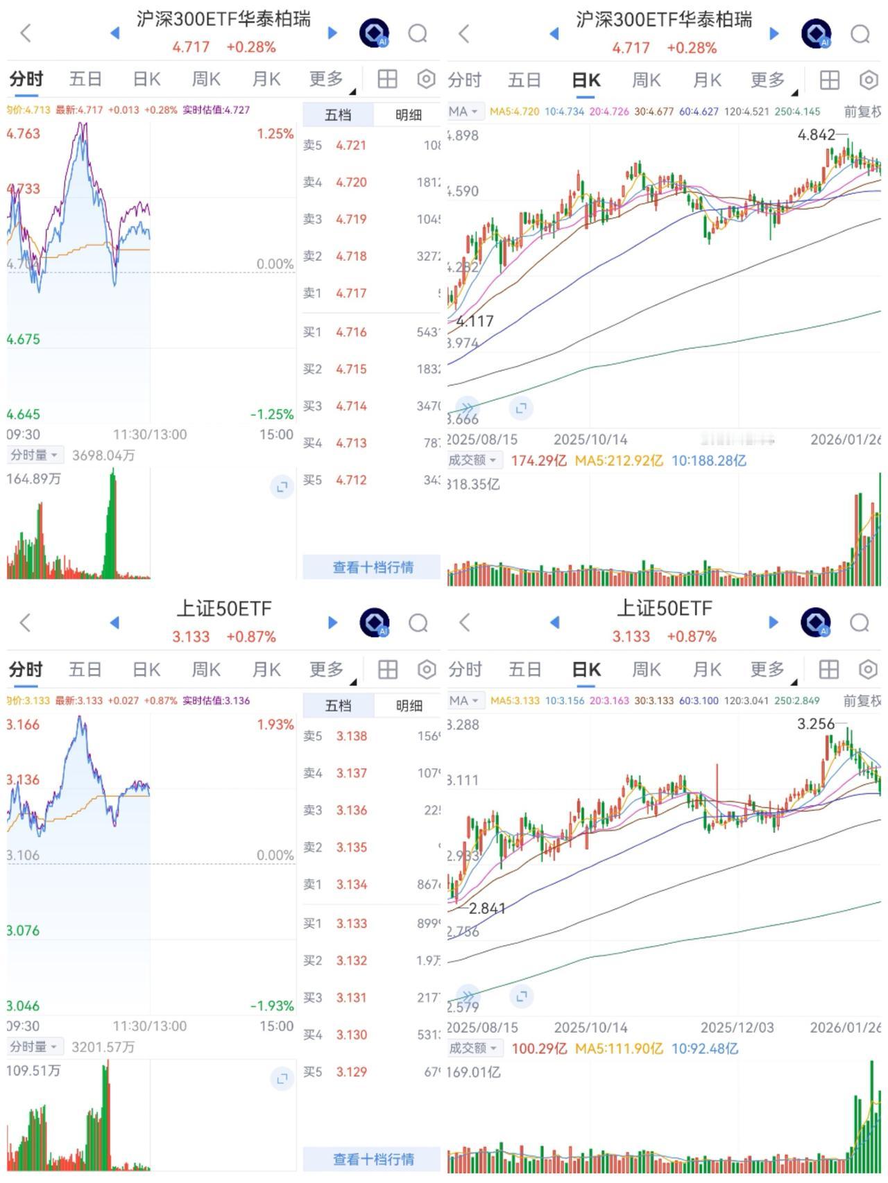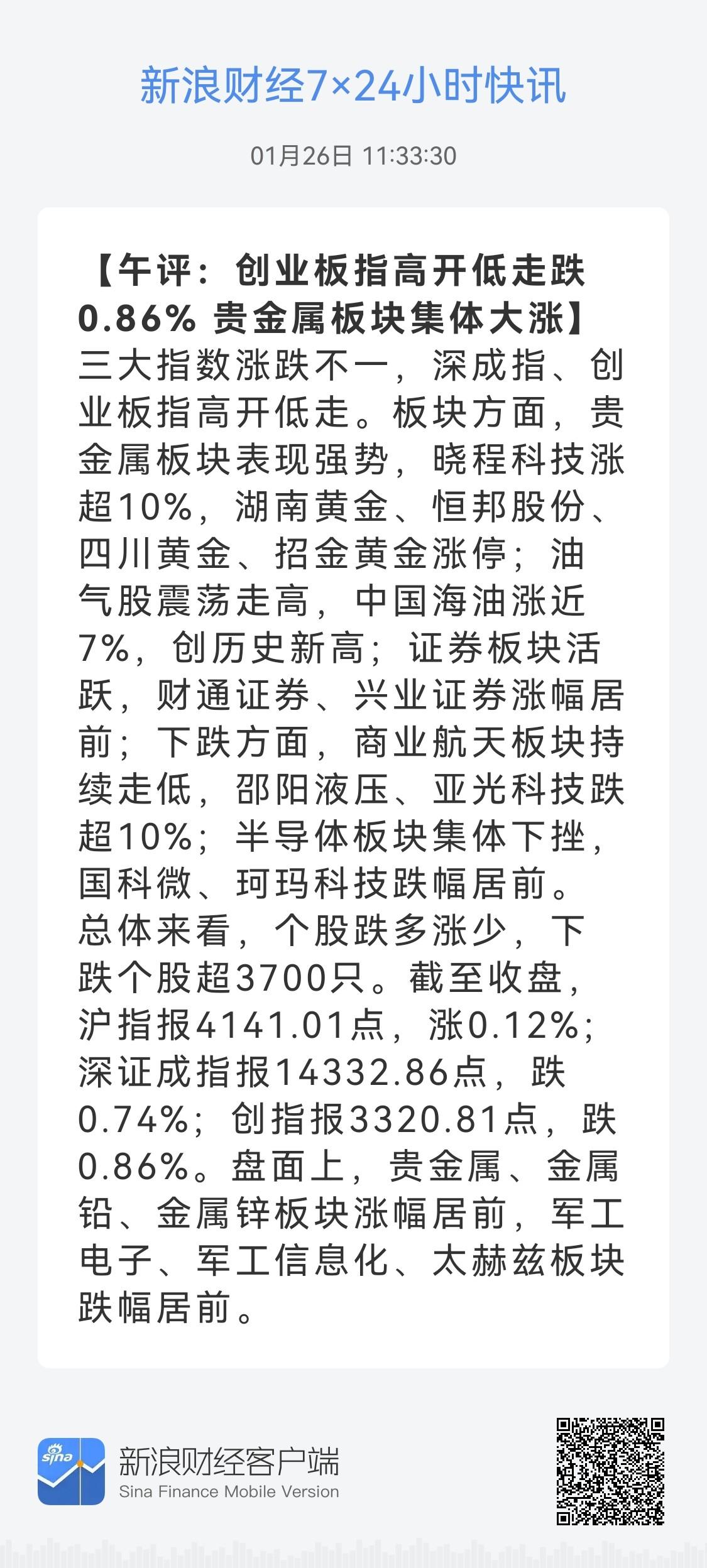午盘印象(1月26日) 航天退潮 个股调整 外围:美股红绿 科技股分化 影响一般 内股:科技调整 红利回暖 深弱沪强 一、三大股指开红: 指数开盘稍强 个股开盘涨平跌比率47%:15%:38%。 个股开盘微强(+10 Vs +26个百分点), 逊于上个交易日,连续反弹势头减弱 二、指数高开又跳水 科技分化,航天连续回暖,红利连续调整 半日交易2.24万亿,量能又疯 降温调控不变 三、涨跌幅榜: 科技调整,红利回暖 跌幅前列:商业航天、半导体、AI应用 涨幅前列:金属、红利、大金融 四、开盘和午盘: 开盘:沪+0.21%、深+0.37%、创+0.48%。 午盘:沪+0.12%、深-0.74%、创-0.86%。 高开又跳水,宽基ETF调控中 五、午盘个股上涨29%,不足三成,与昨日涨跌差距(-39 Vs +32个百分点),大幅恶化 相比开盘,跌涨差扩大,下跌个股逐渐增加 净流入 -845 (-54)亿,资金巨幅流出 六、沪深两市成交量午盘22,408亿,上个交易日18,929亿,同比量能大幅扩张近3,500亿,放量冲高回落。 七、指数连续主动调控,量能大涨控盘又紧 融资额连续2天中幅上升之后,昨日微幅下降-14亿,几乎打平,调控坚定资金已谨慎 午后两种情形: 1、横盘震荡:时间换空间,震荡消化获利,主要看航天能否企稳。 2、震荡回调:谨防信心回落而跳水,航天退潮打击情绪,回调而慢牛格局不变。 (图片源自网络侵权告知删除)