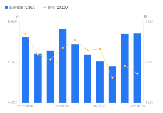 日期A股户数(户)流通A股户均持股数(股)户均持股市值(万元)2026-01-09535358288.9617.192025-12-19494978965.1817.802025-12-10501118855.3319.472025-11-28509458710.3619.082025-11-20522238497.2019.252025-11-10541208199.3618.102025-10-31514438626.0418.292025-10-20510738688.5318.752025-10-10531158354.5019.292025-09-30544588148.4719.08