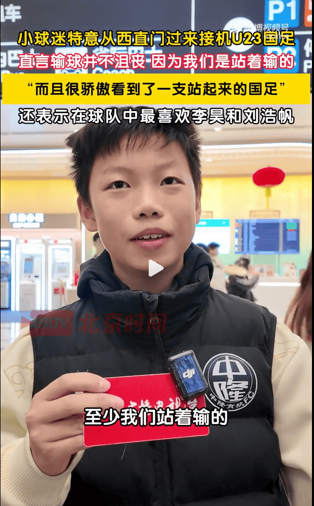 面对球队在比赛中失利,小球迷表示并不沮丧:“其实我挺骄傲的,因为我们输给的是世界一流的强队,很骄傲能看到一支站起来的国足、正在兴起的国足。”