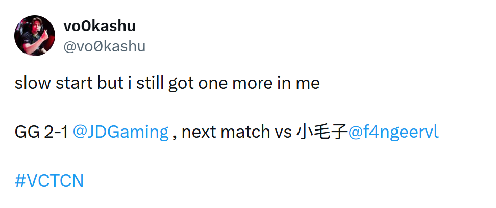 胜者组半决赛对阵AG,vo0kashu发文:下一场vs小毛子f4ngeer